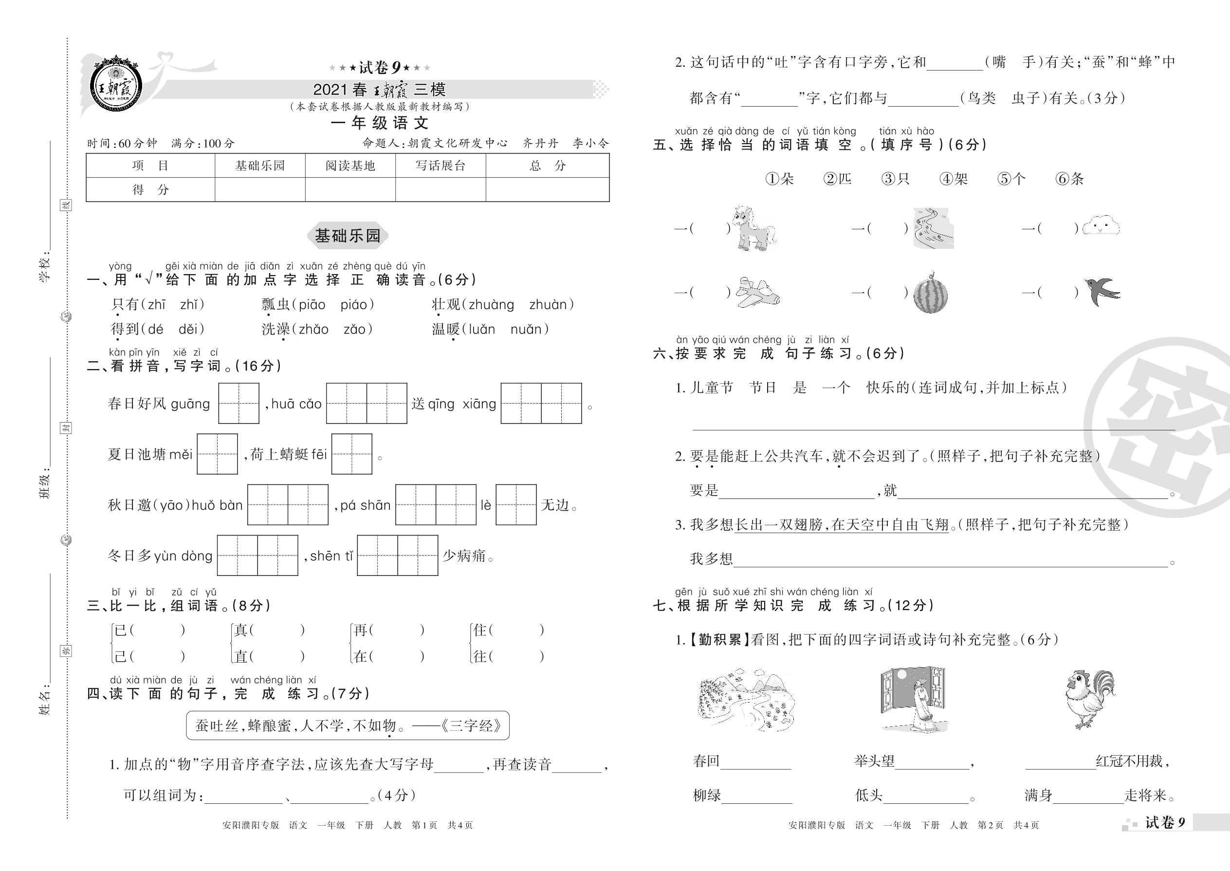王朝霞期末模拟卷一年级下册语文(人教版)_R210731172754【9】