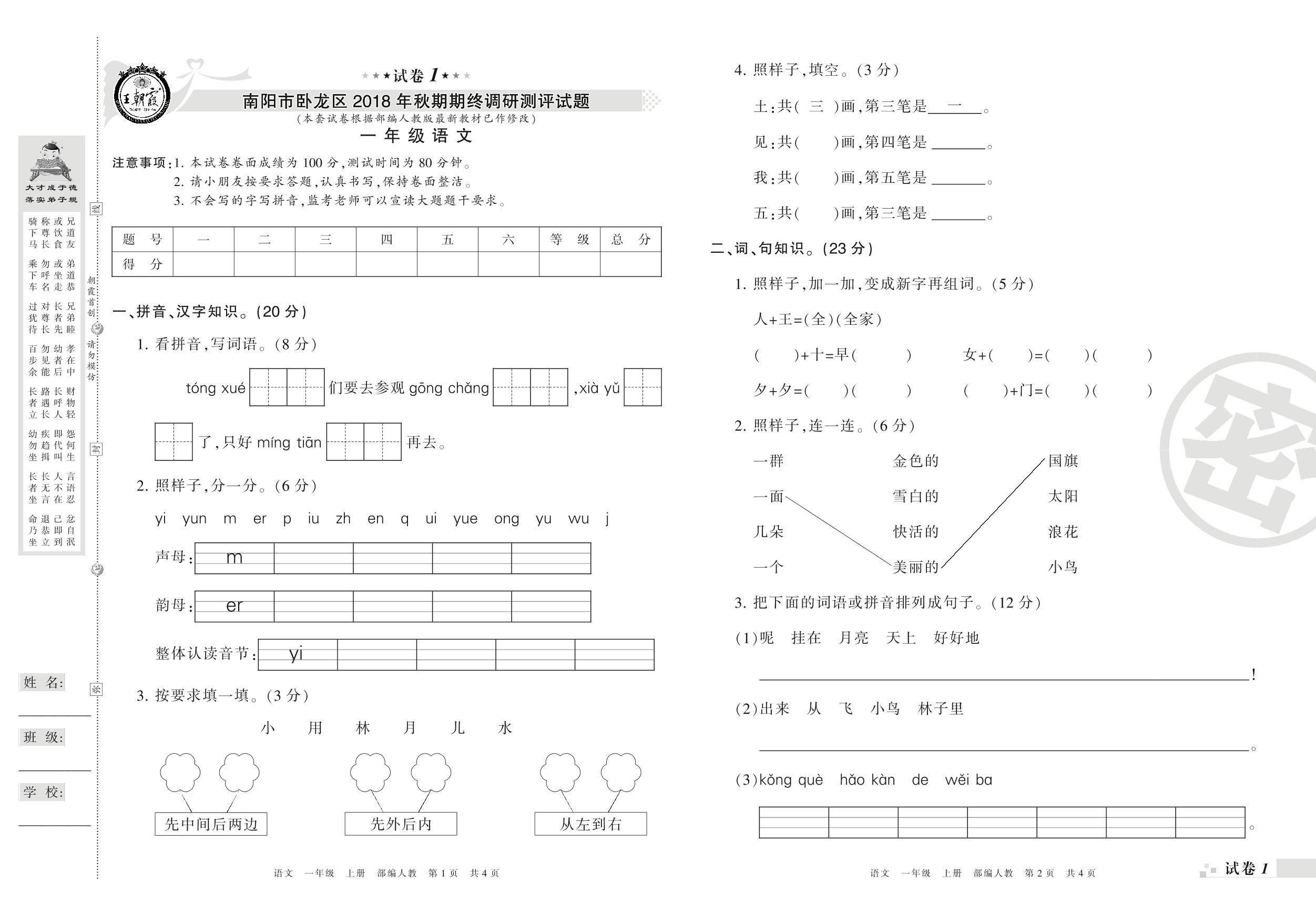 2018-2019学年第一学期南阳市卧龙区一年级语文试卷(人教版)【1】