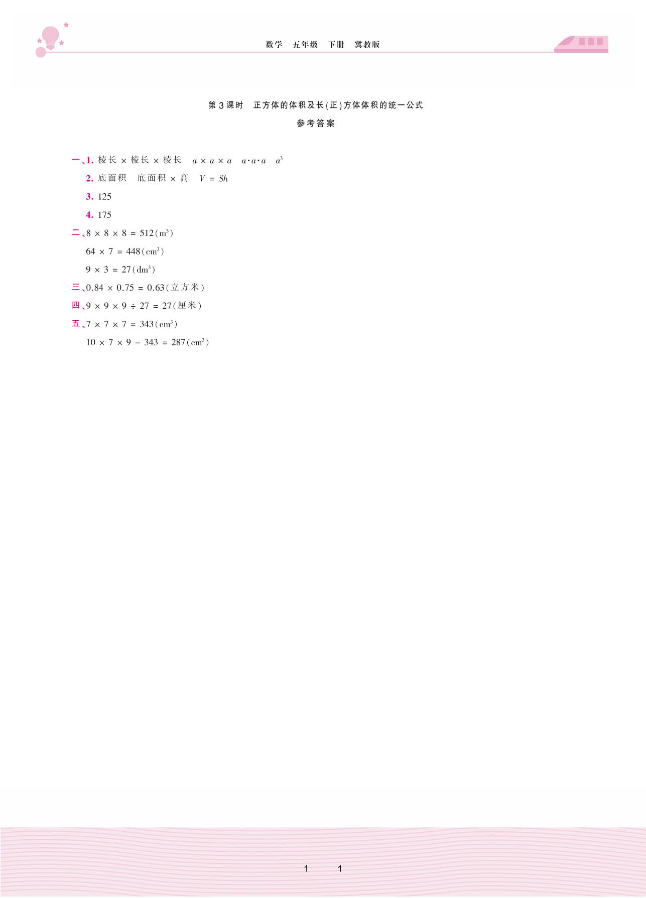 2021下册五年级数学冀教版 五 长方体和正方体的体积 1. 体积和体积单位——第3课时 正方体的体积及长(正)方体体积的统一公式答案