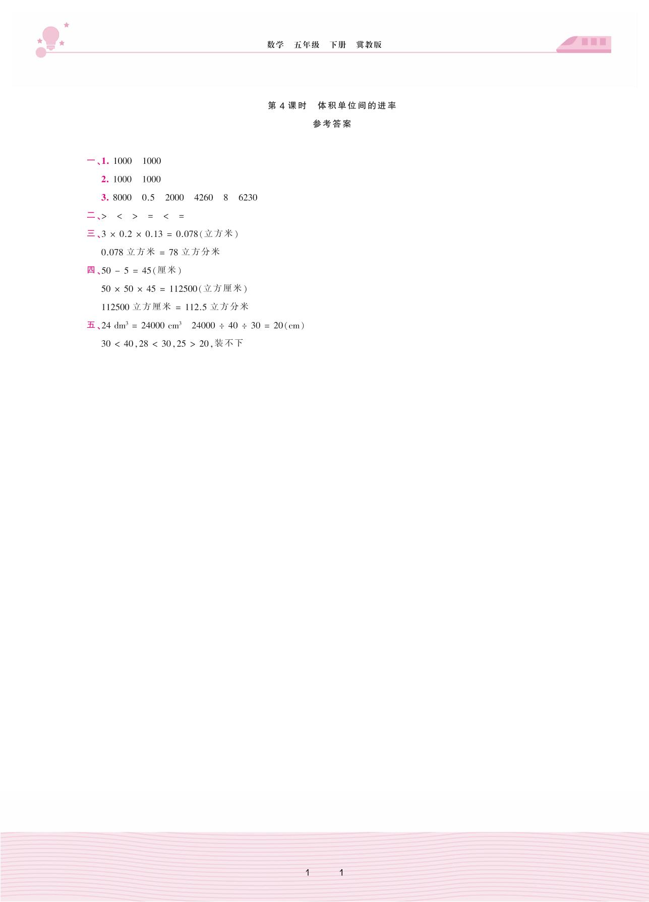 2021下册五年级数学冀教版 五 长方体和正方体的体积 1. 体积和体积单位——第4课时 体积单位间的进率答案