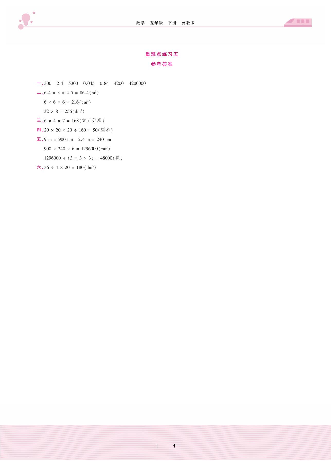 2021下册五年级数学冀教版 五 长方体和正方体的体积——重难点练习五答案