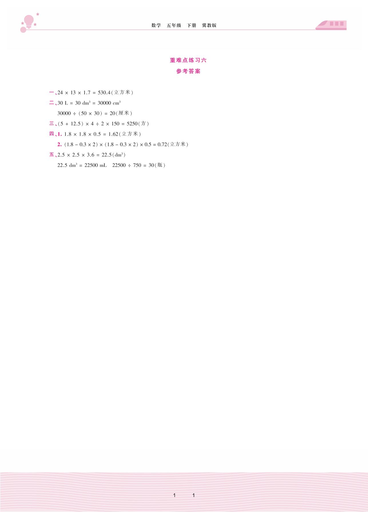 2021下册五年级数学冀教版 五 长方体和正方体的体积 2. 应用问题——重难点练习六答案