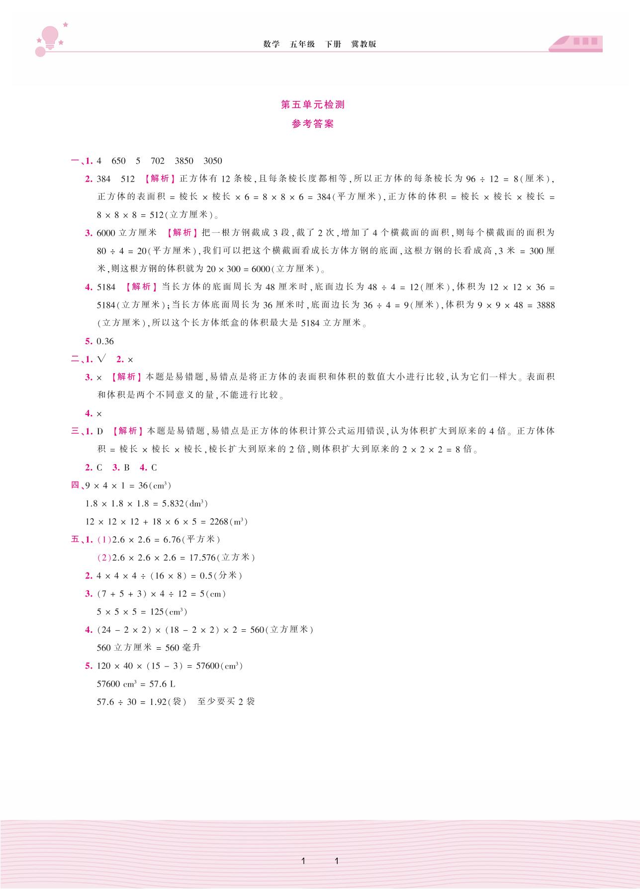 2021下册五年级数学冀教版 五 长方体和正方体的体积——第五单元检测答案