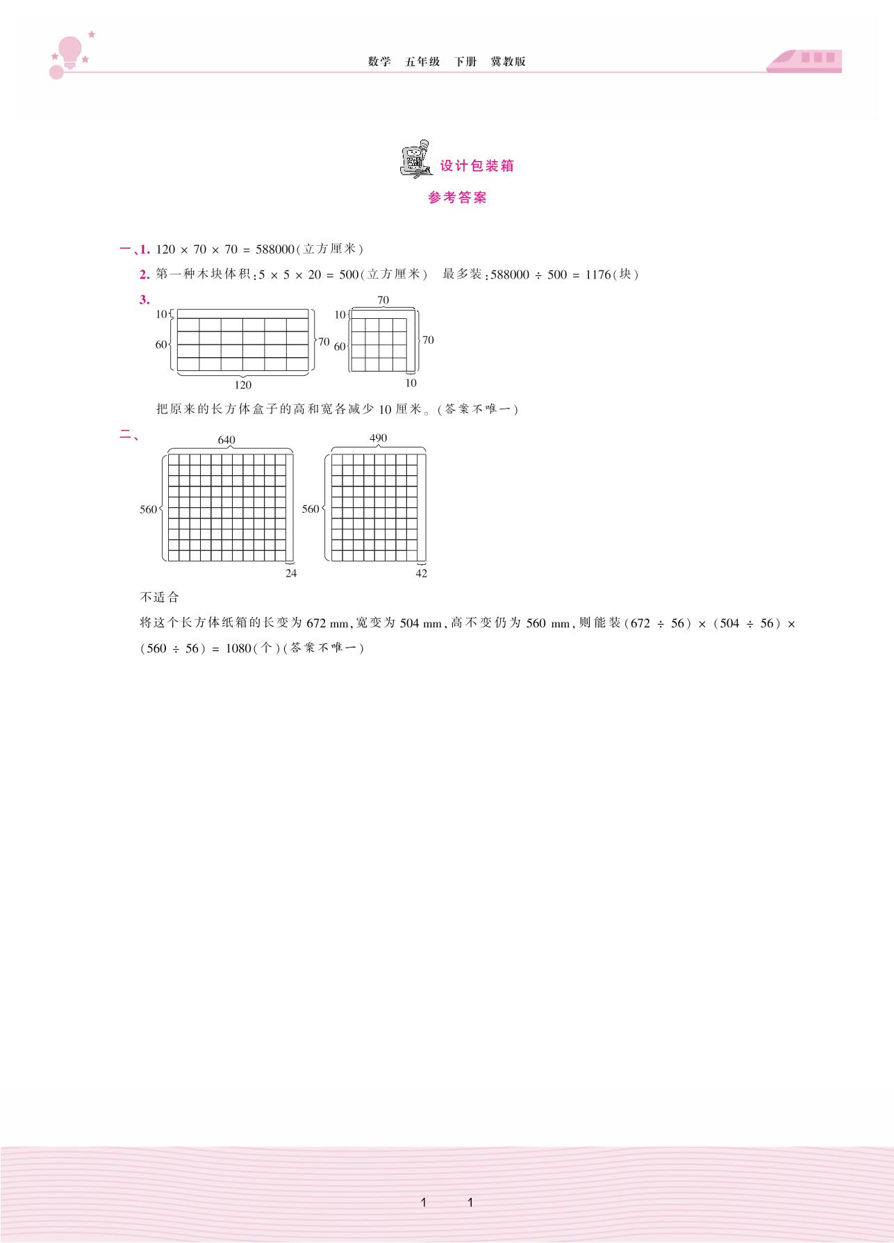 2021下册五年级数学冀教版 五 长方体和正方体的体积——设计包装箱答案