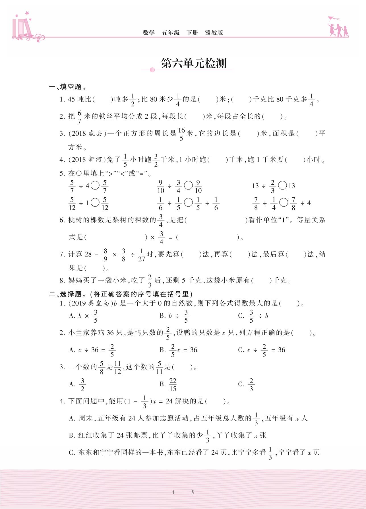 2021下册五年级数学冀教版 六 分数除法——第六单元检测