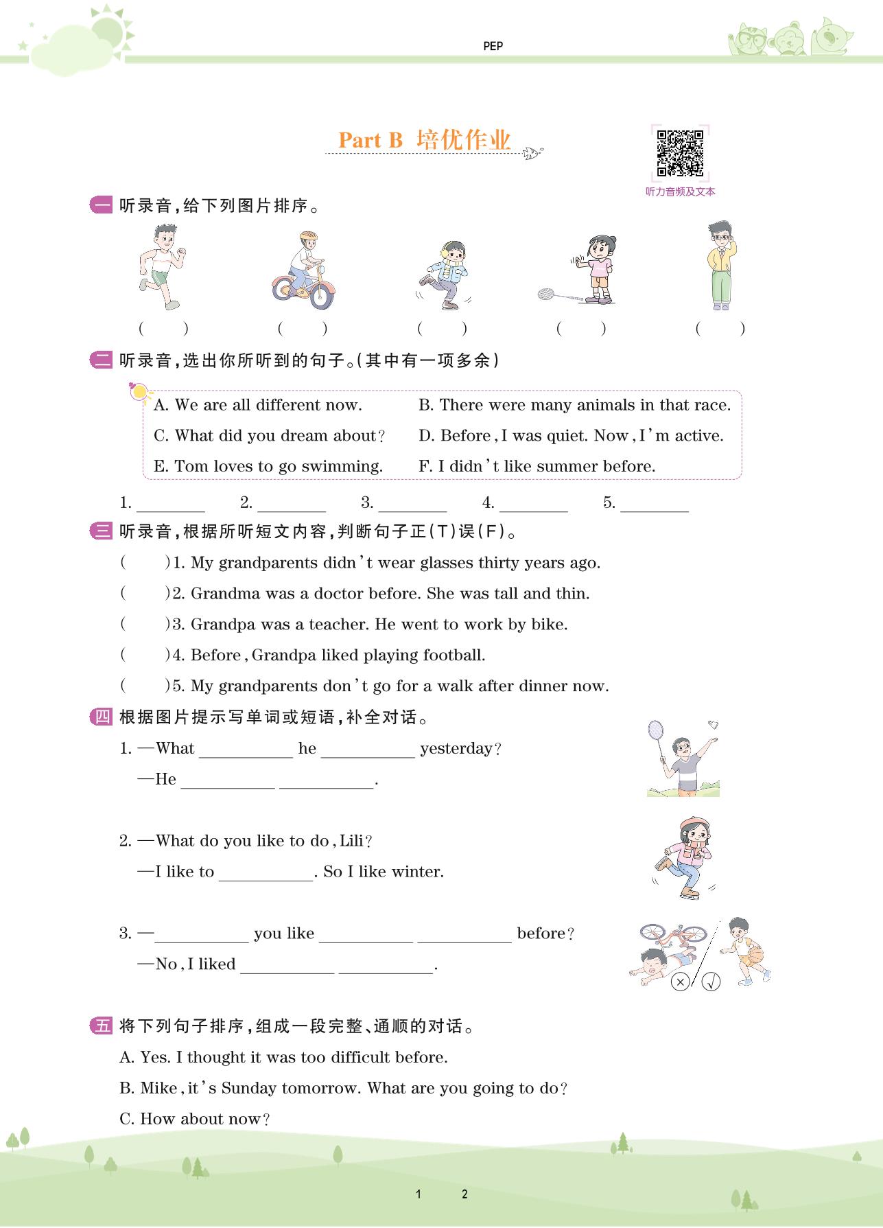 六年级英语人教PEP版(三起始)下册课时作业