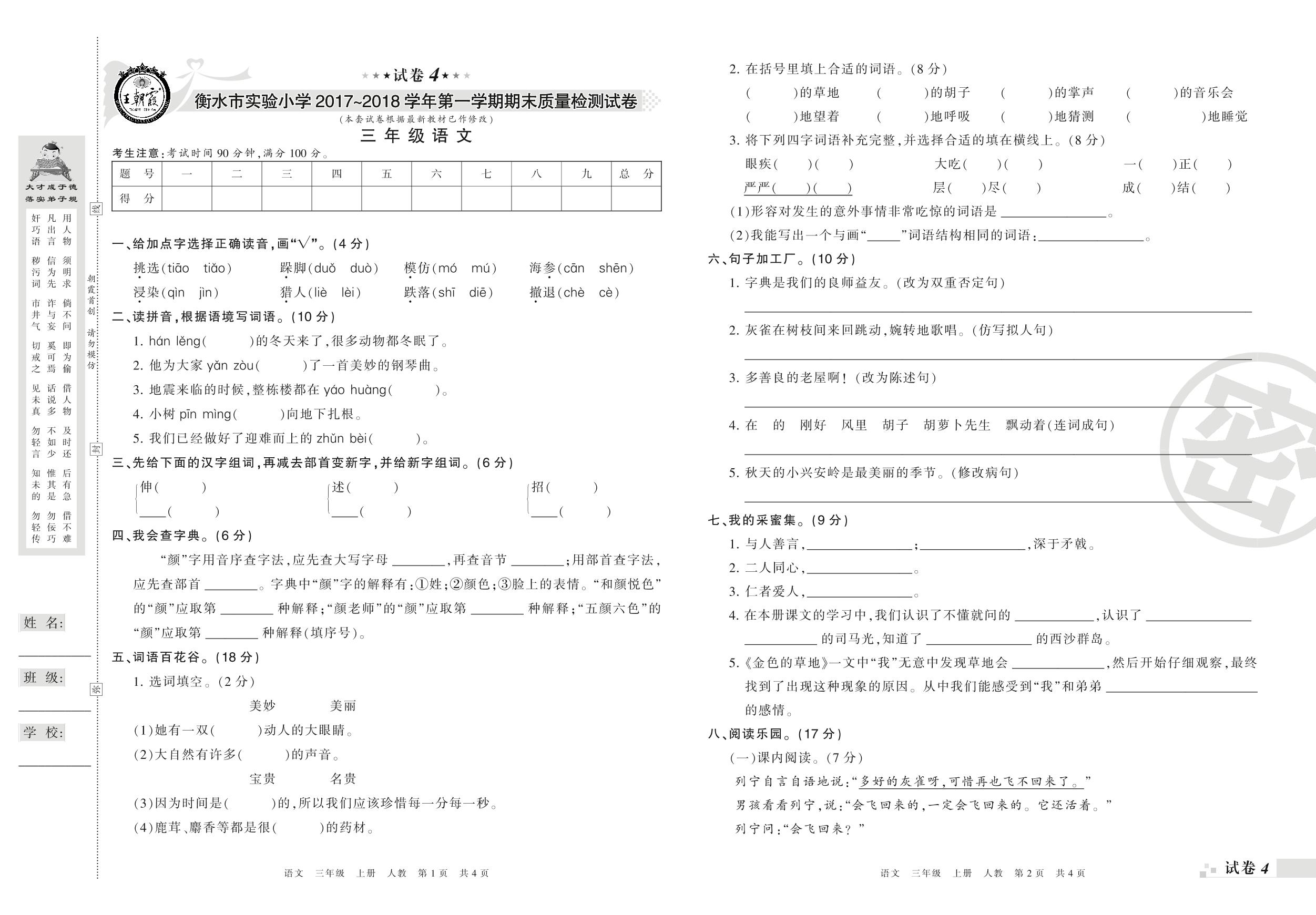2017-2018学年第一学期衡水市实验小学三年级语文试卷(人教版)【4】