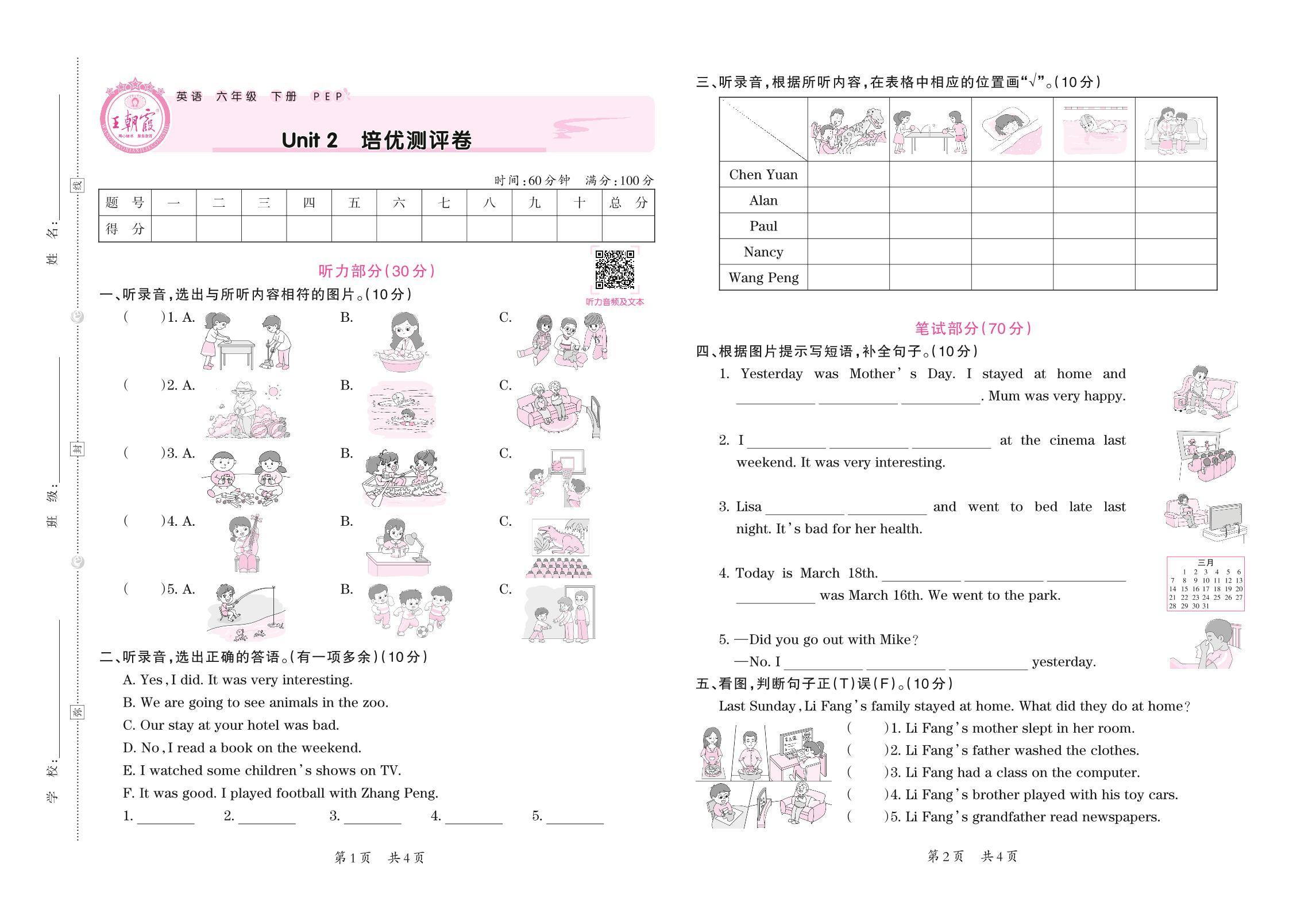 2021下册六年级英语PEP版 Unit 2 培优测评卷