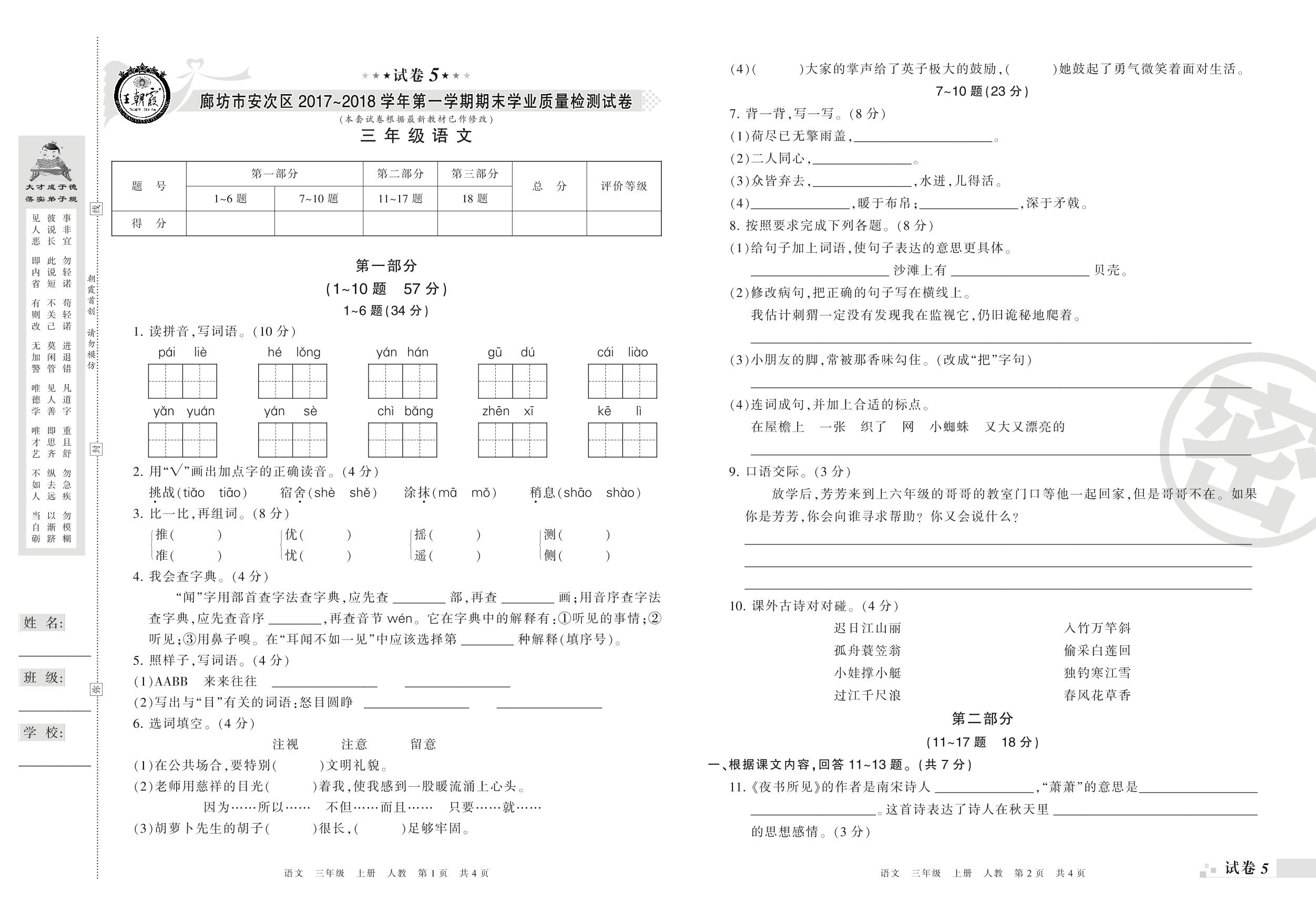 2017-2018学年第一学期廊坊市安次区三年级语文试卷(人教版)【5】