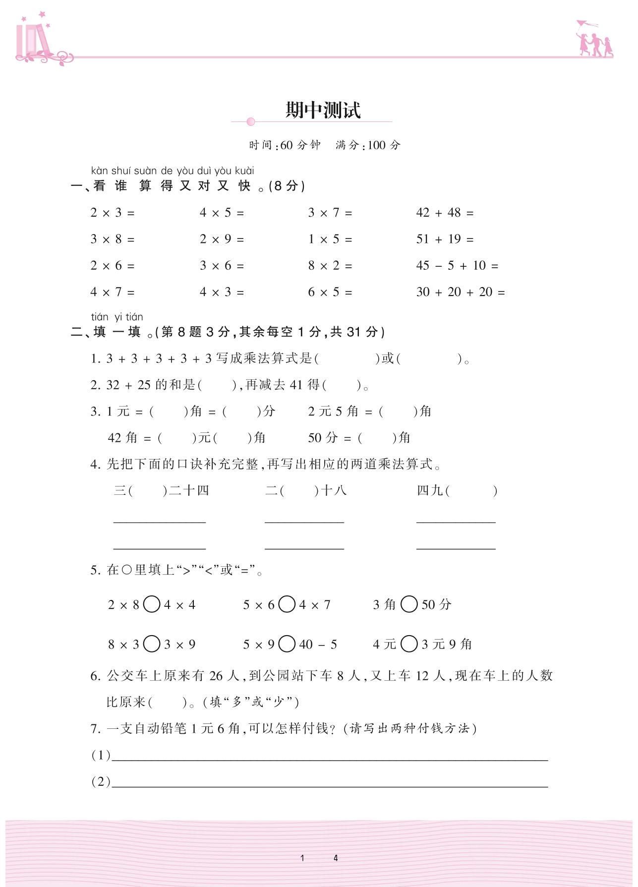 2020上册二年级数学北师版 期中测试_R210922154242296