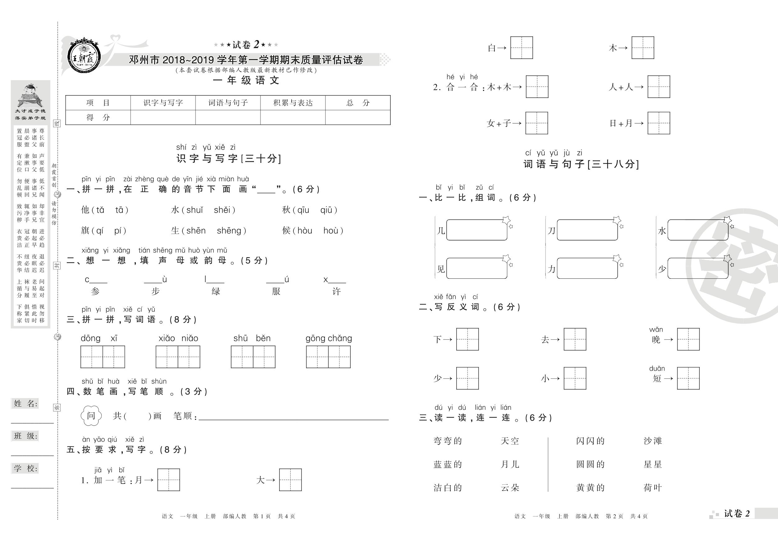 2018-2019学年第一学期邓州市一年级语文试卷(人教版)【2】