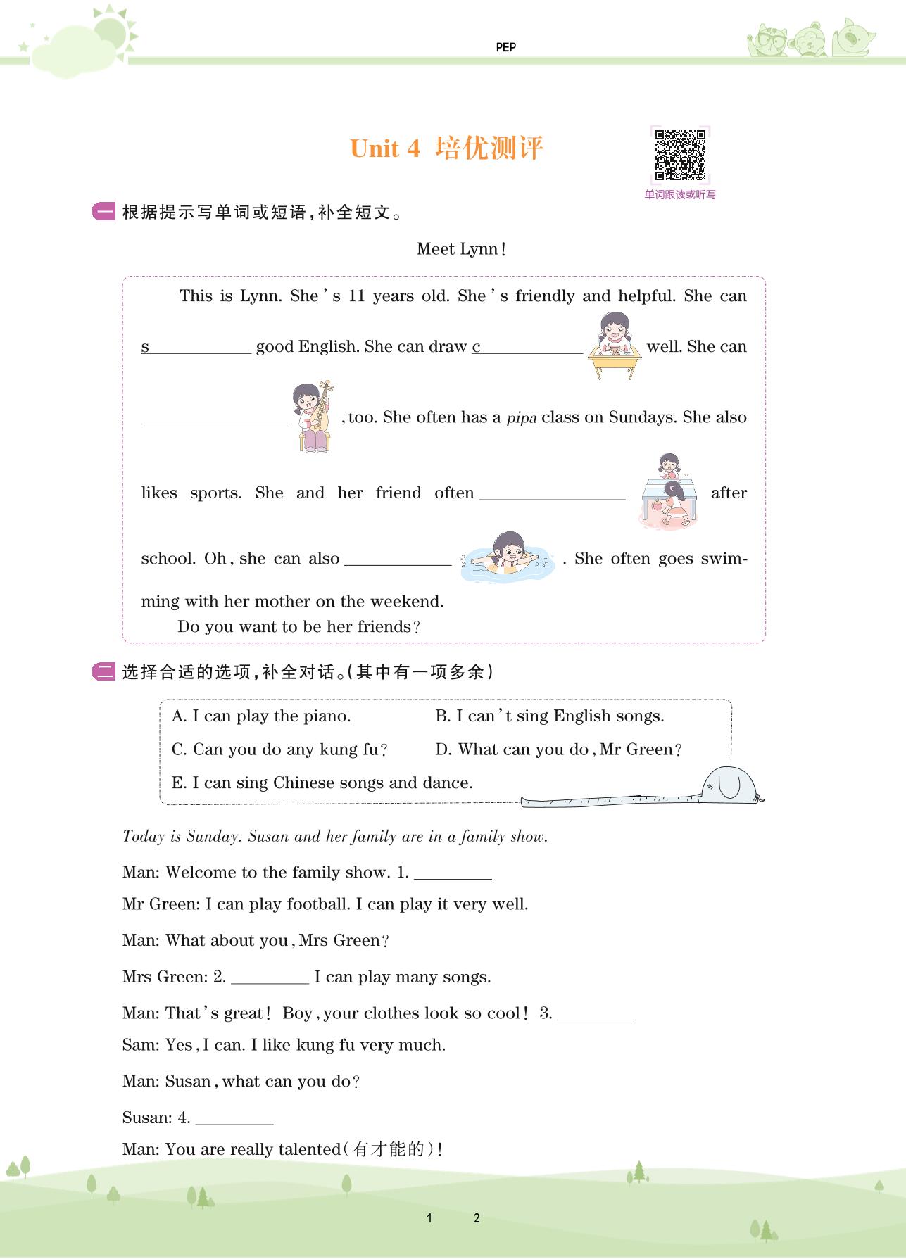 2020上册五年级英语人教PEP版 Unit 4 What can you do?——Unit 4 培优测评