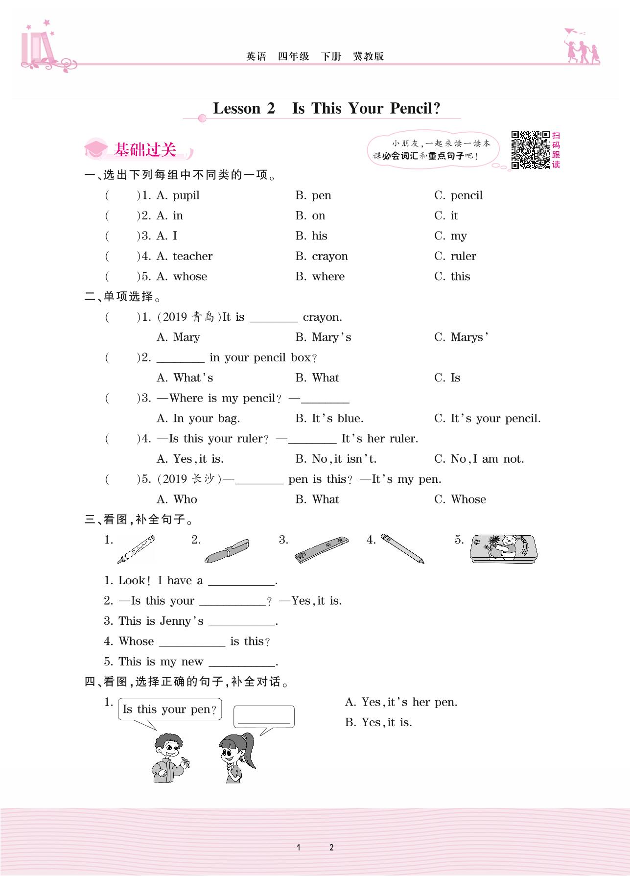 2021下册四年级英语冀教版 Unit 1—Lesson 2 Is This Your Pencil?