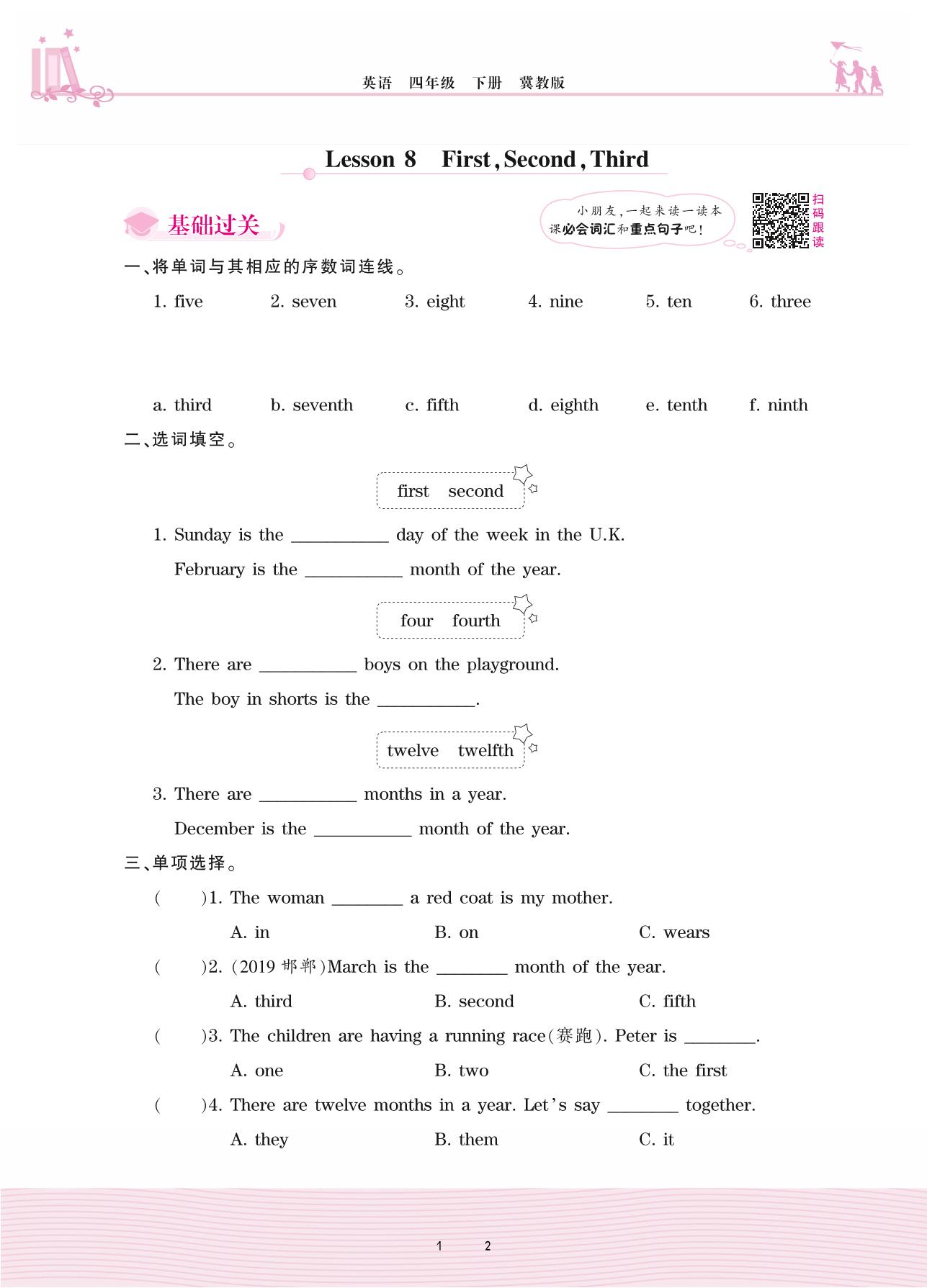 2021下册四年级英语冀教版 Unit 2—Lesson 8 First,Second,Third