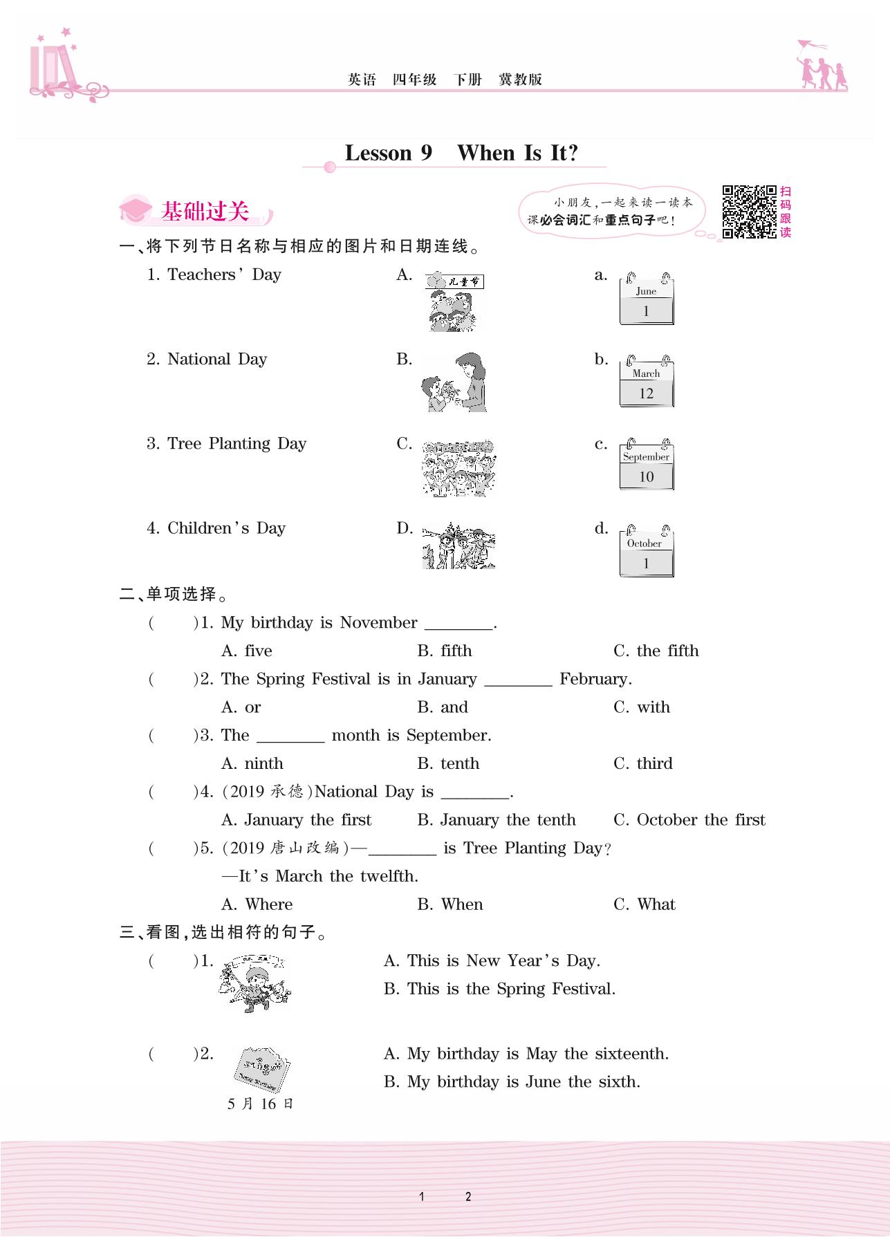 2021下册四年级英语冀教版 Unit 2—Lesson 9 When Is It?