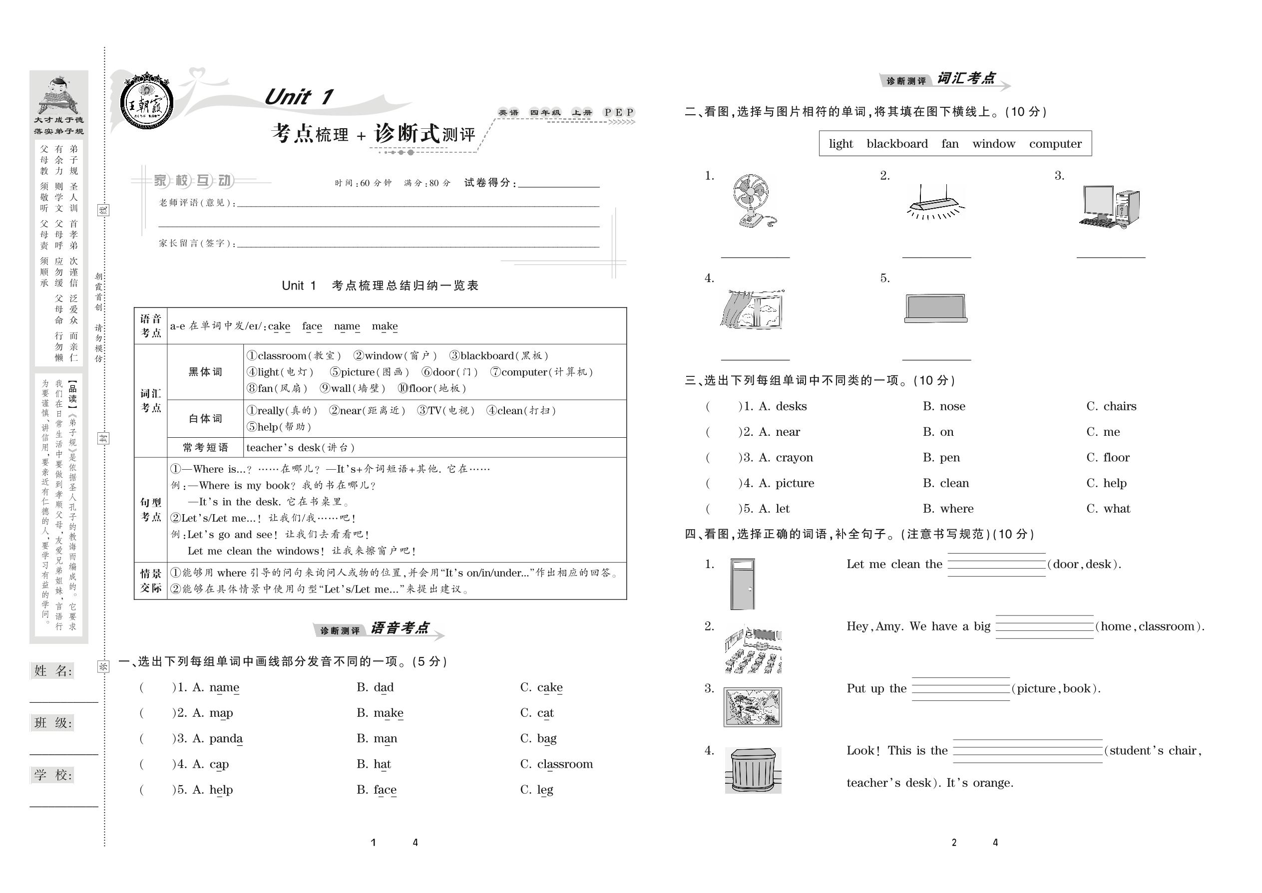 2020上册四年级英语PEP版 Unit 1 考点梳理+诊断式测评