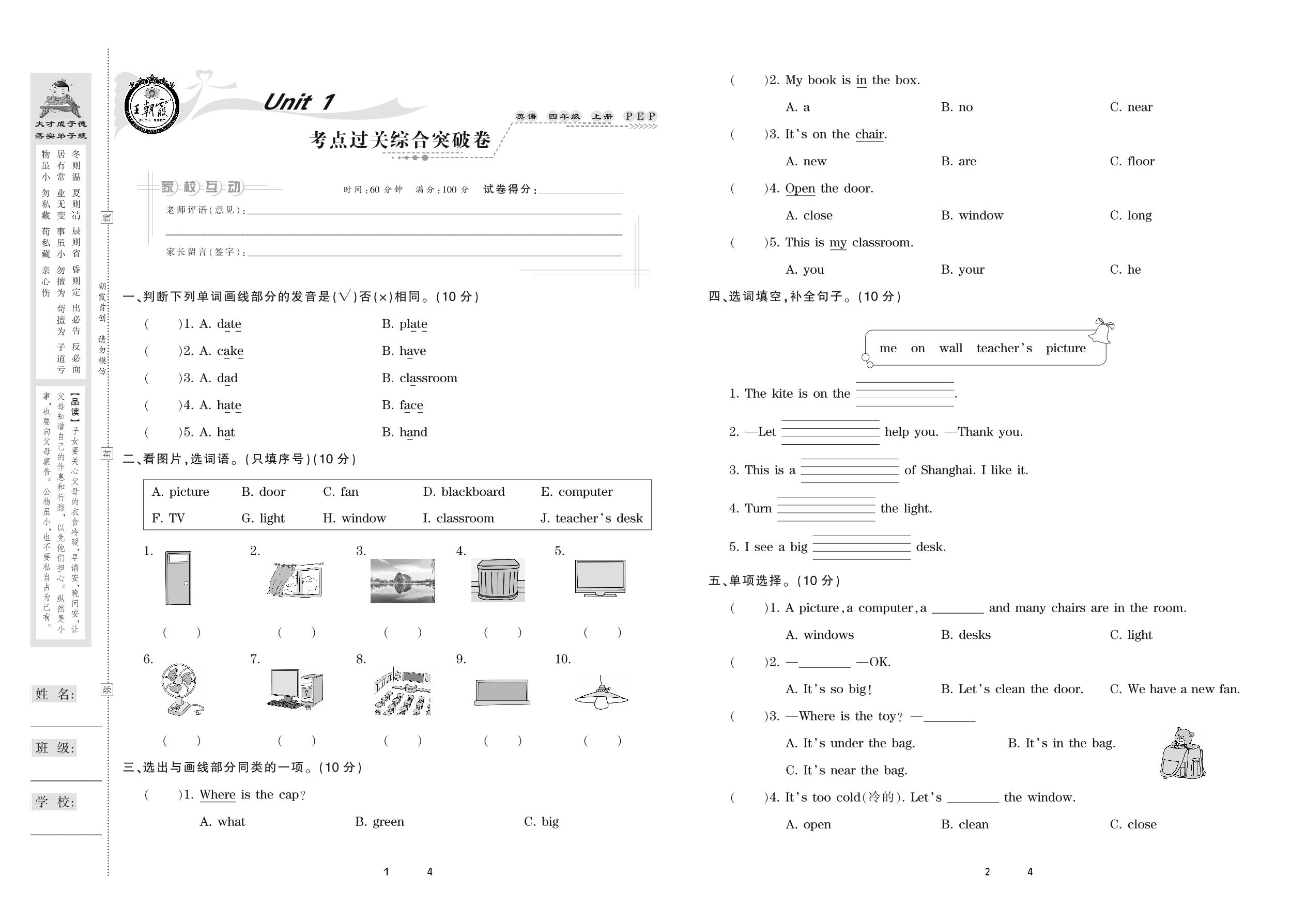 2020上册四年级英语PEP版 Unit 1 考点过关综合突破卷