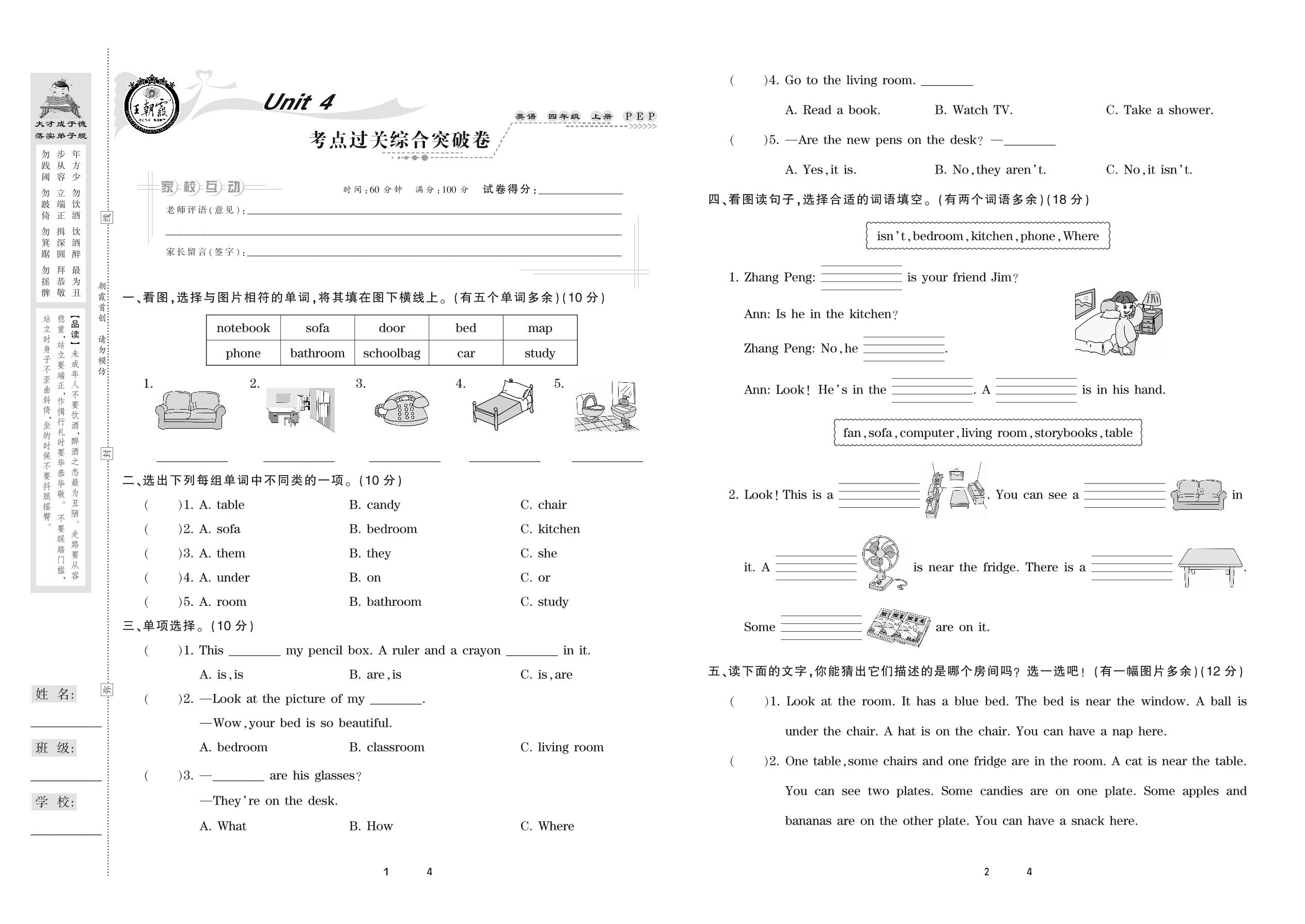 2020上册四年级英语PEP版 Unit 4 考点过关综合突破卷