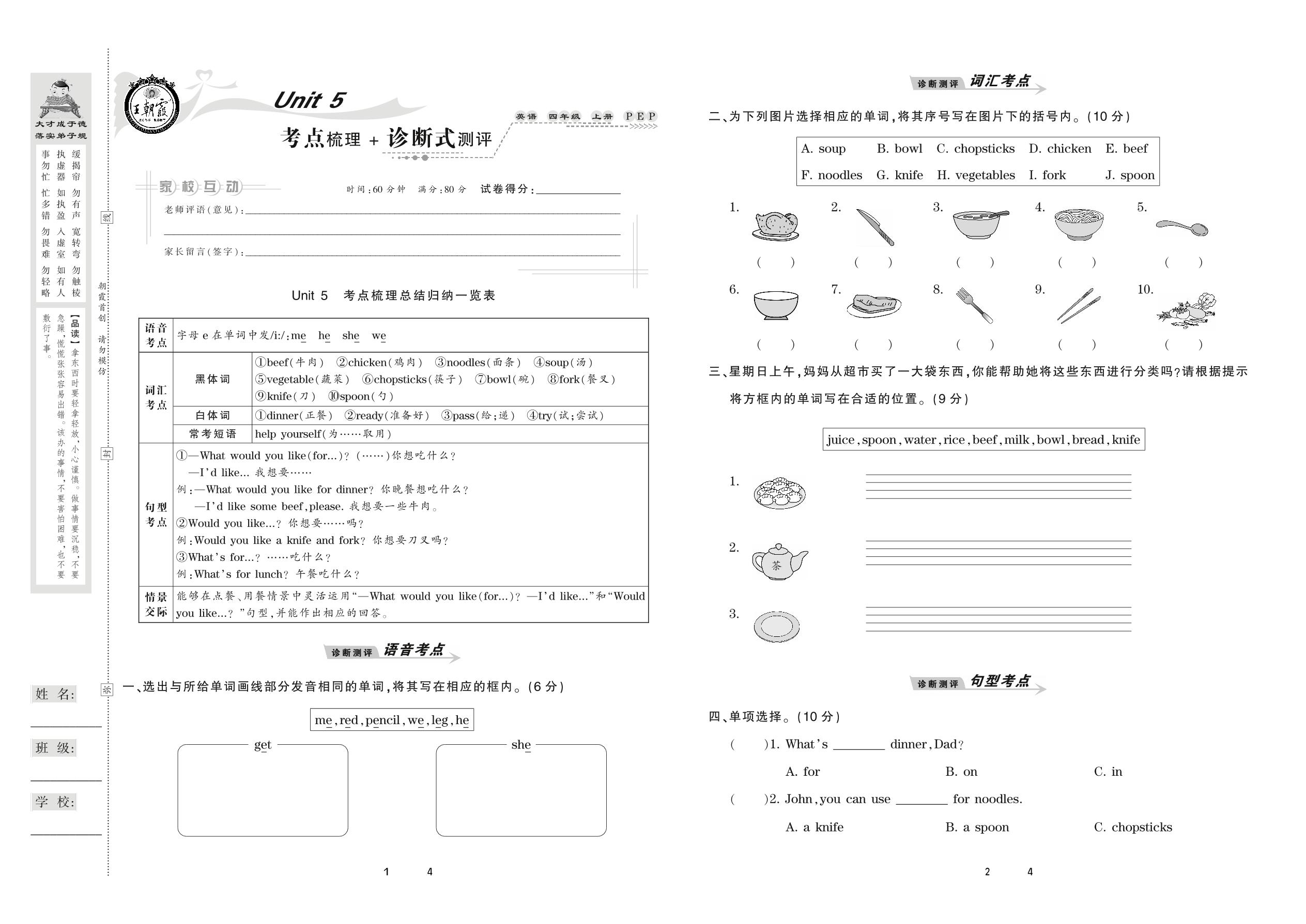 2020上册四年级英语PEP版 Unit 5 考点梳理+诊断式测评