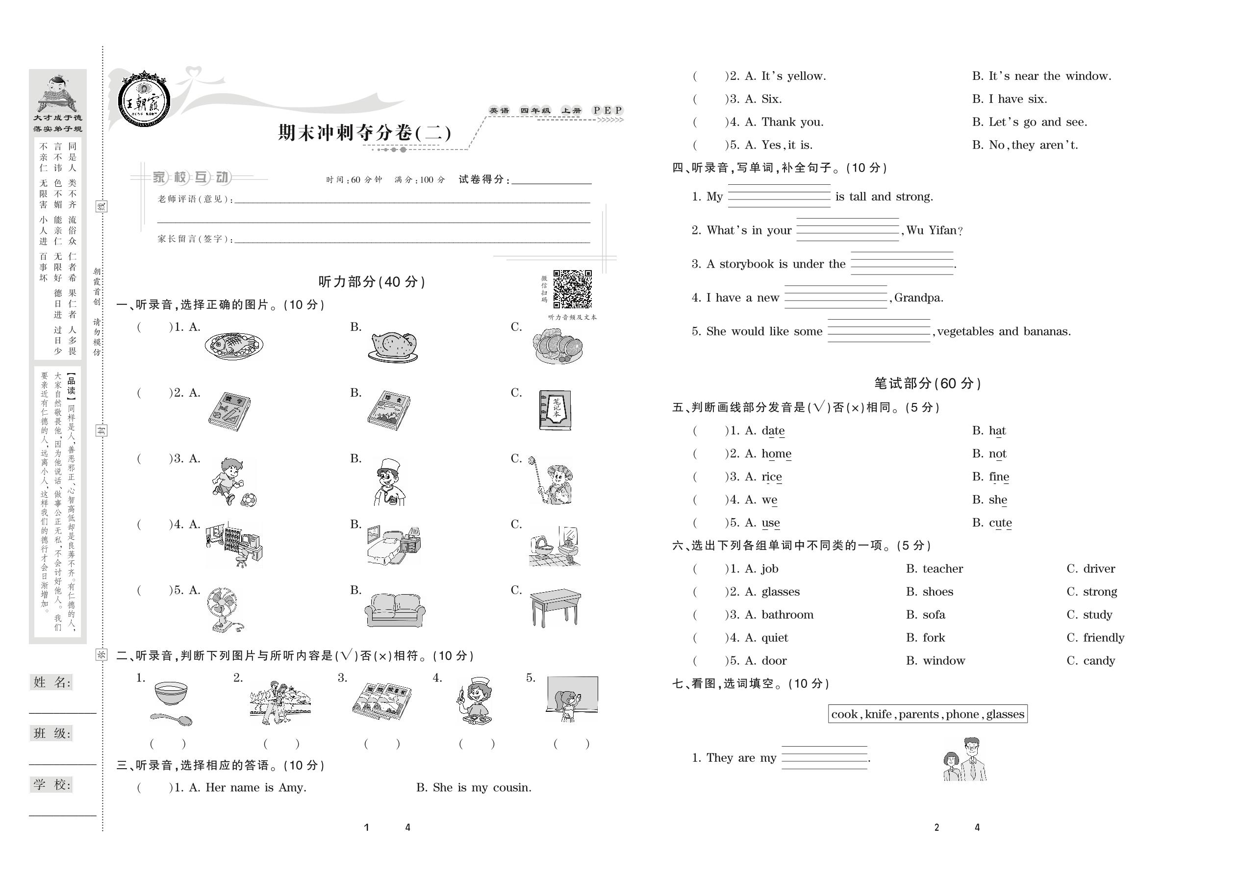 四年级英语人教PEP版(三起始)上册期末卷