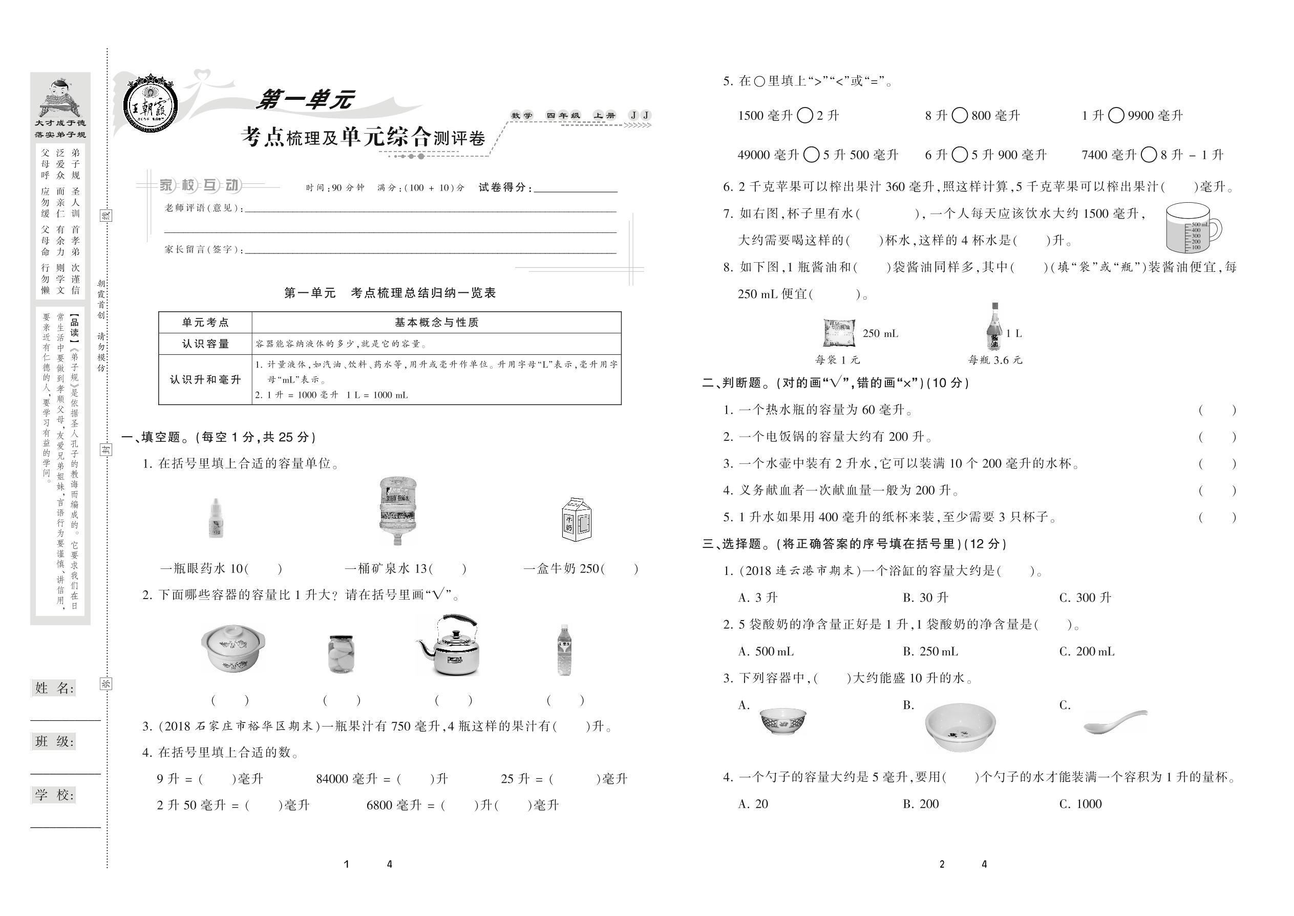 2020上册四年级数学冀教版 第一单元 考点梳理及单元综合测评卷