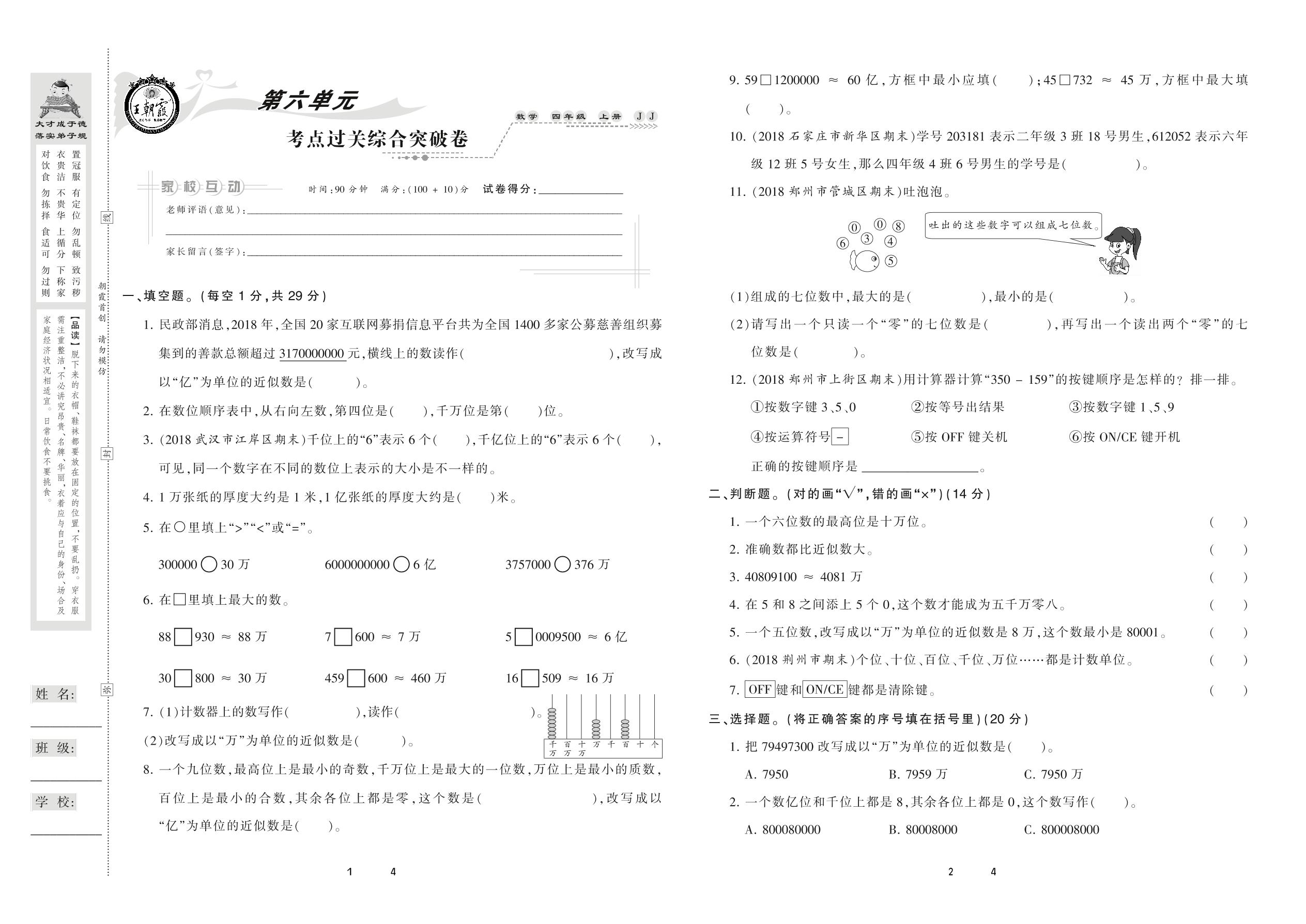 2020上册四年级数学冀教版 第六单元 考点过关综合突破卷