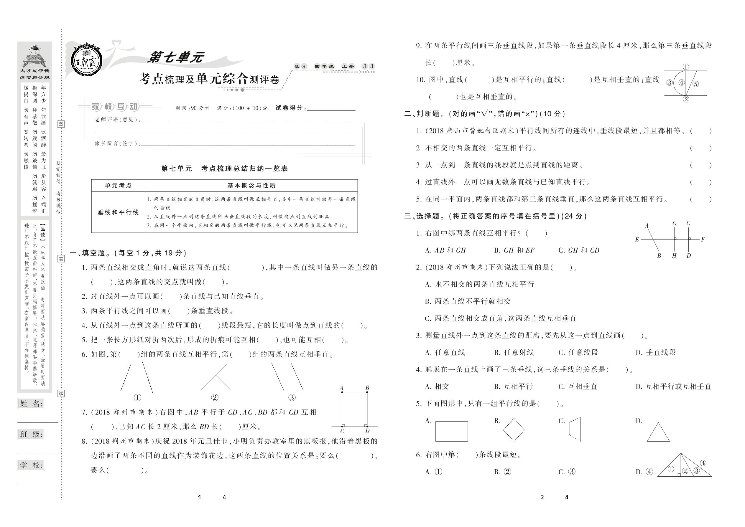 2020上册四年级数学冀教版 第七单元 考点梳理及单元综合测评卷