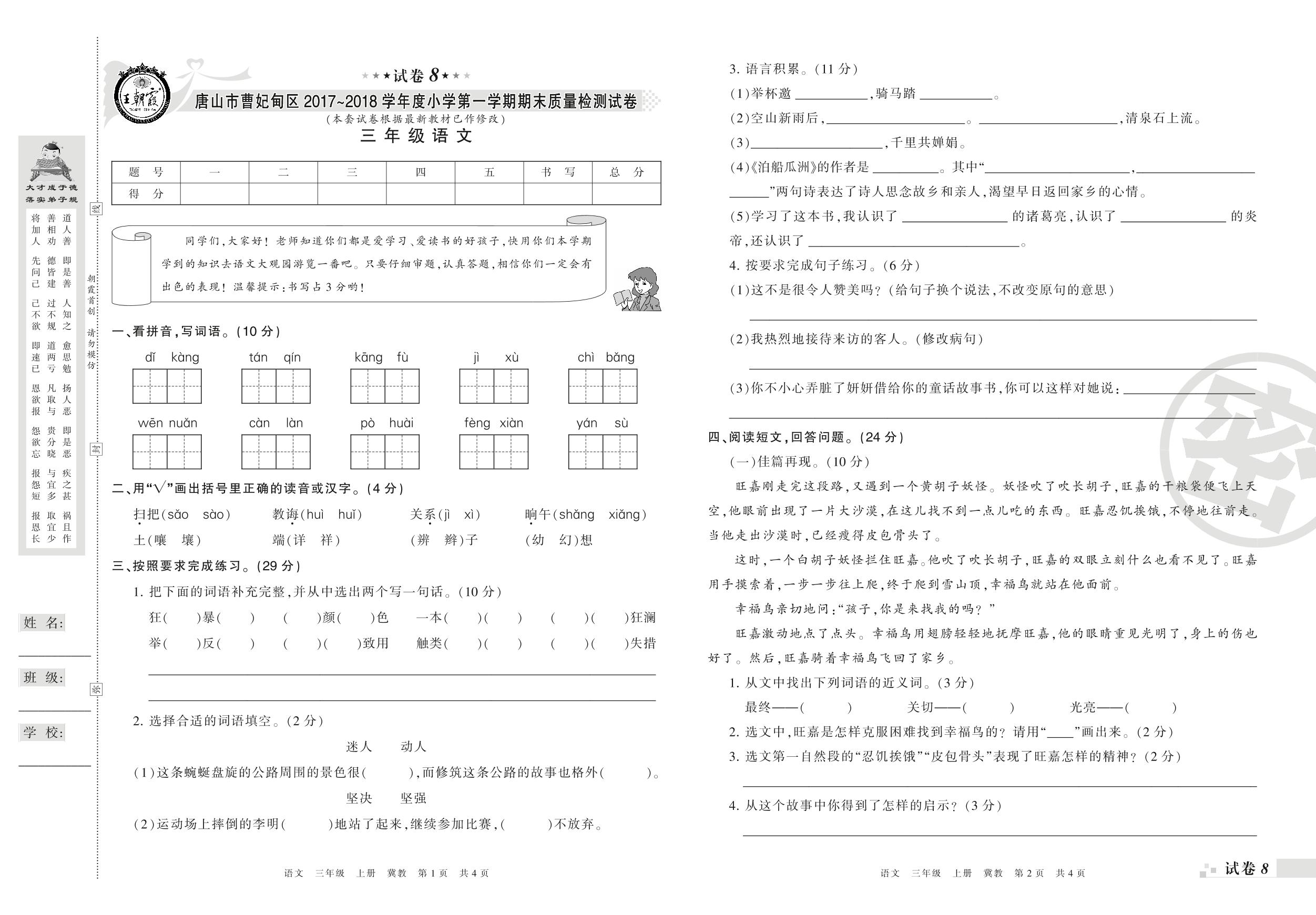 2017-2018学年第一学期唐山市曹妃甸区三年级语文试卷(冀教版)【8】