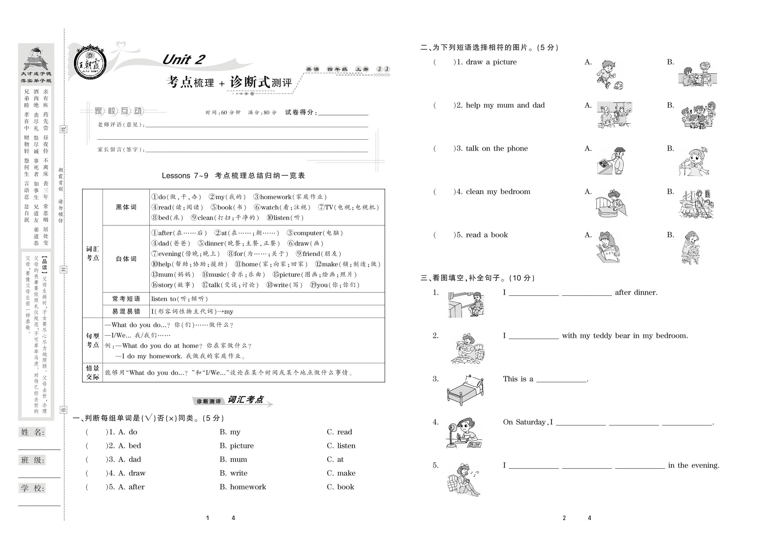 2020上册四年级英语冀教版 Unit 2 考点梳理+诊断式测评 Lessons 7-9