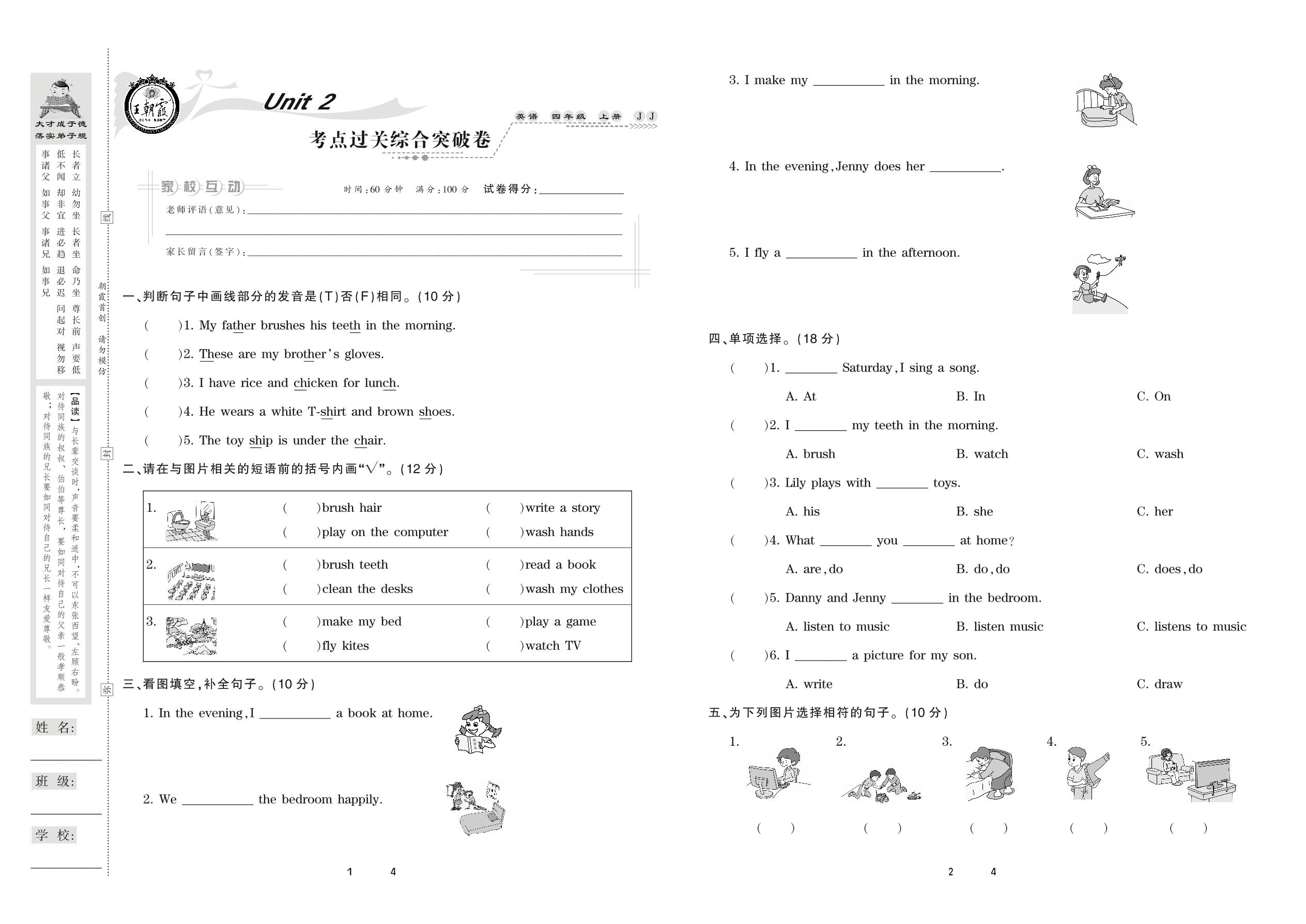 2020上册四年级英语冀教版 Unit 2 考点过关综合突破卷