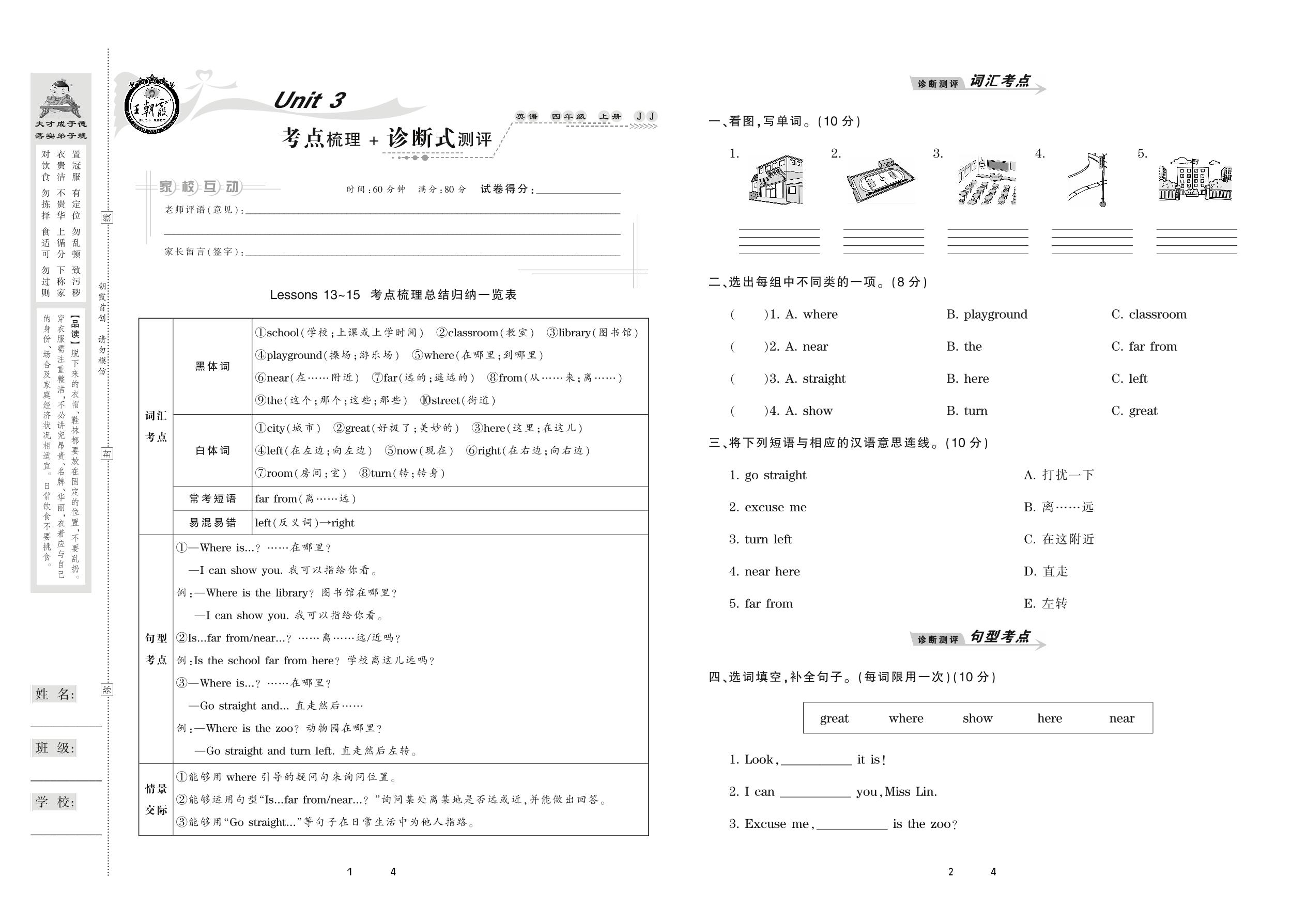 2020上册四年级英语冀教版 Unit 3 考点梳理+诊断式测评 Lessons 13-15