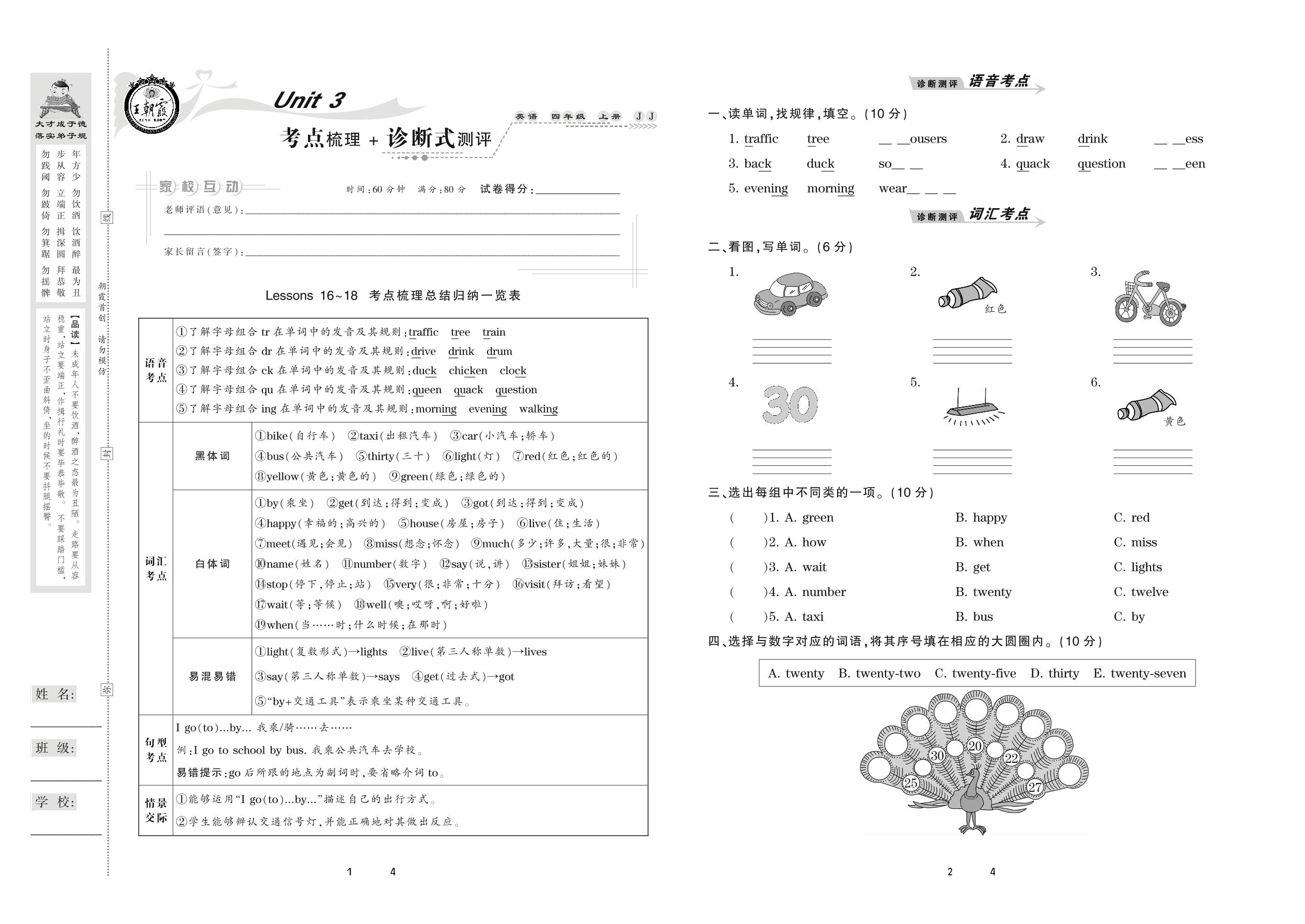 2020上册四年级英语冀教版 Unit 3 考点梳理+诊断式测评 Lessons 16-18