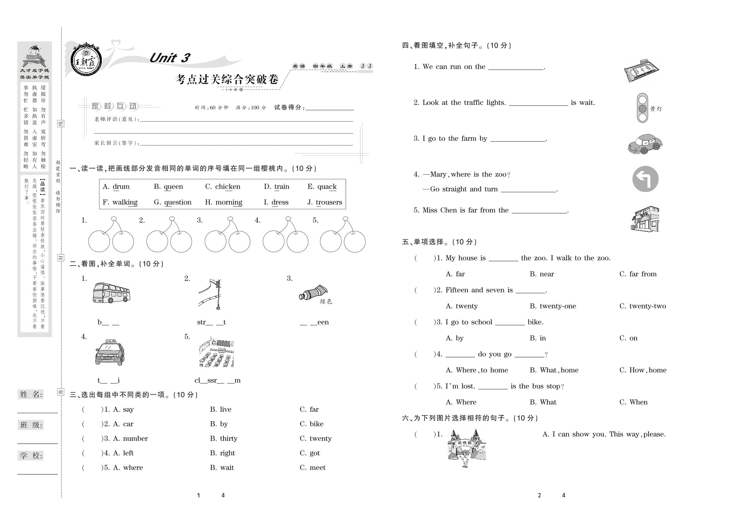 2020上册四年级英语冀教版 Unit 3 考点过关综合突破卷