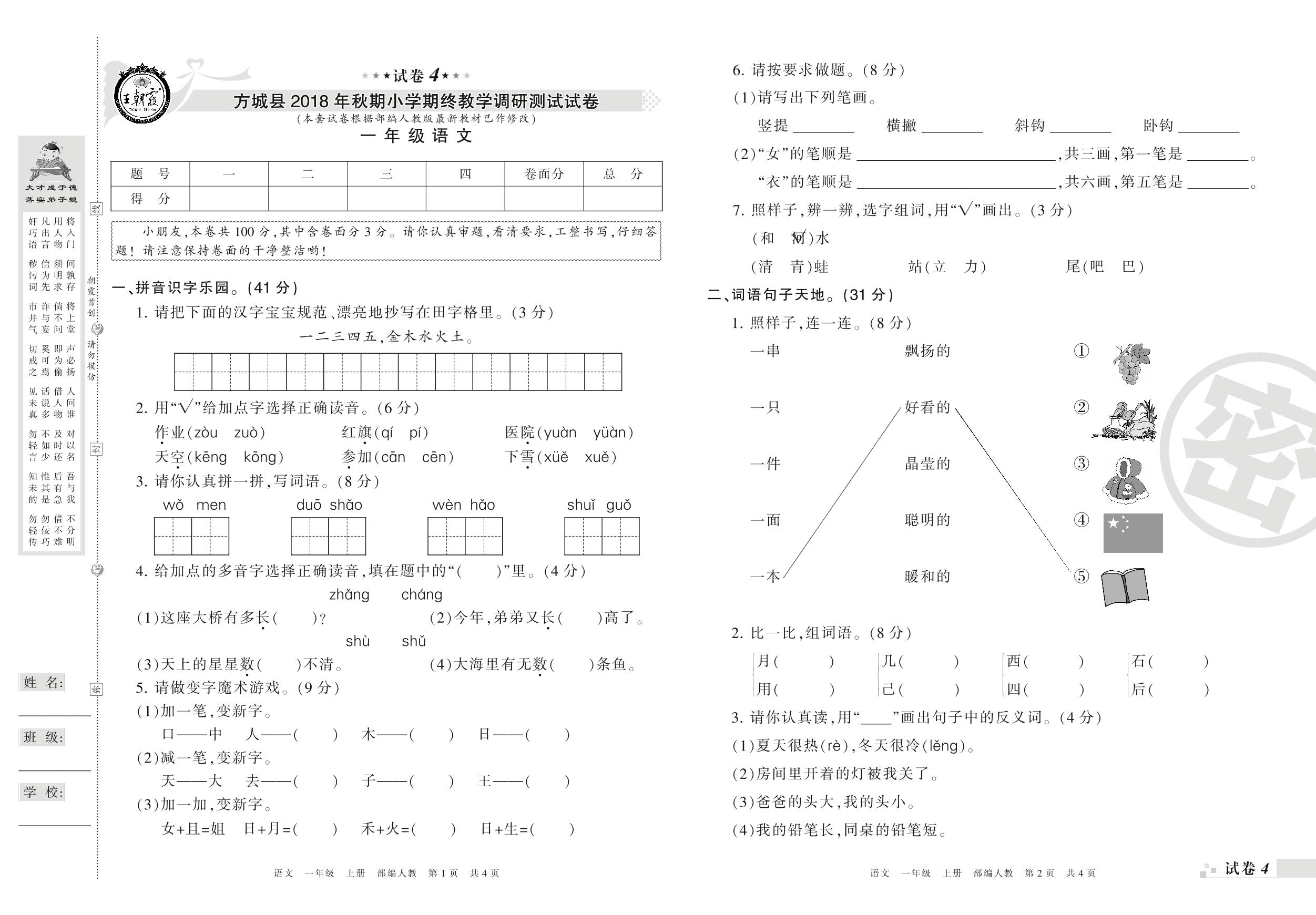 2018-2019学年第一学期南阳市方城县一年级语文试卷(人教版)【4】