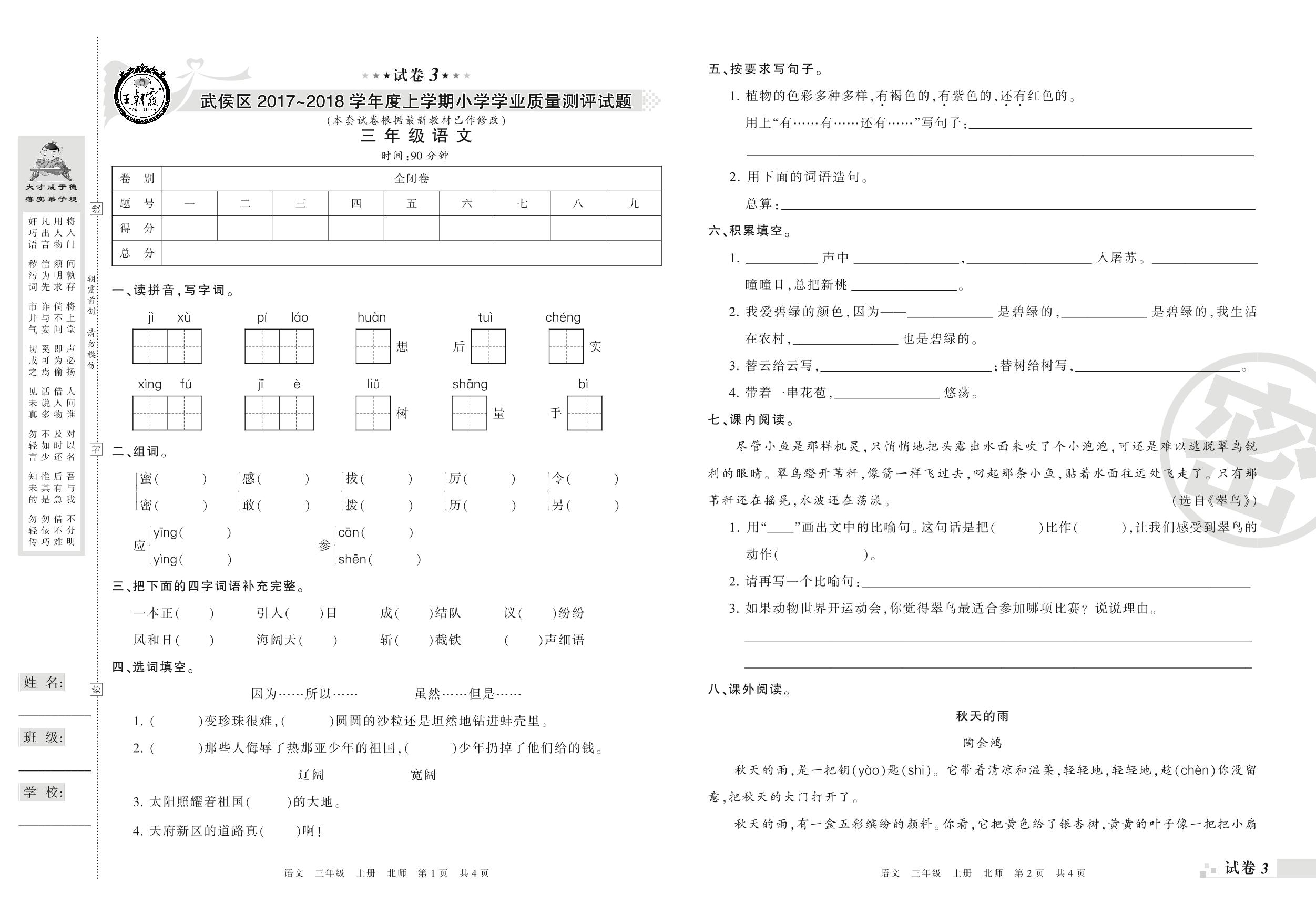 2017-2018学年第一学期成都市武侯区三年级语文试卷(北师版)【3】