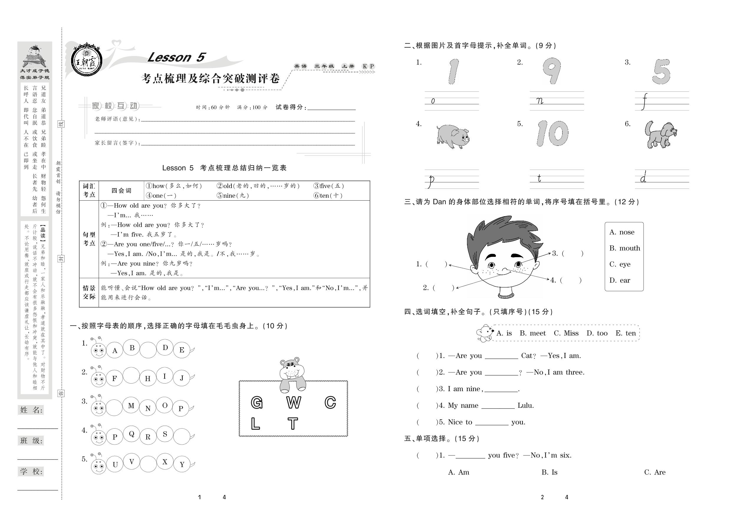 2020上册三年级英语科普版 Lesson 5 考点梳理及综合突破测评卷