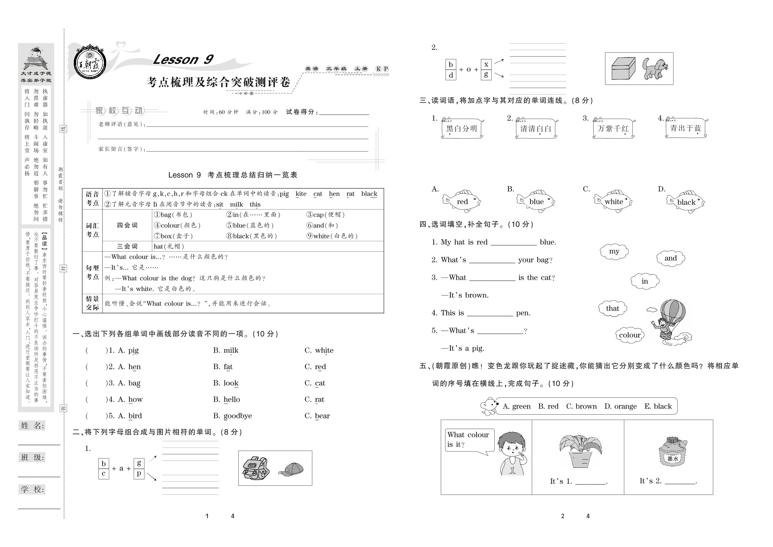 2020上册三年级英语科普版 Lesson 9 考点梳理及综合突破测评卷