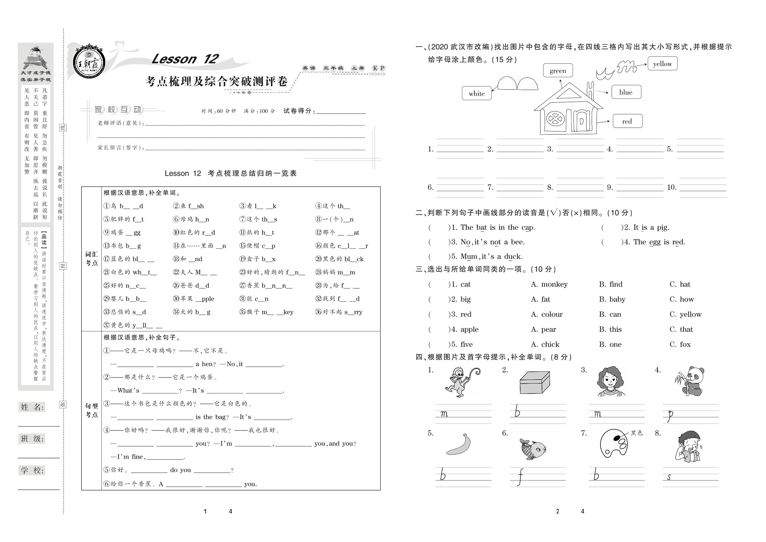 2020上册三年级英语科普版 Lesson 12 考点梳理及综合突破测评卷