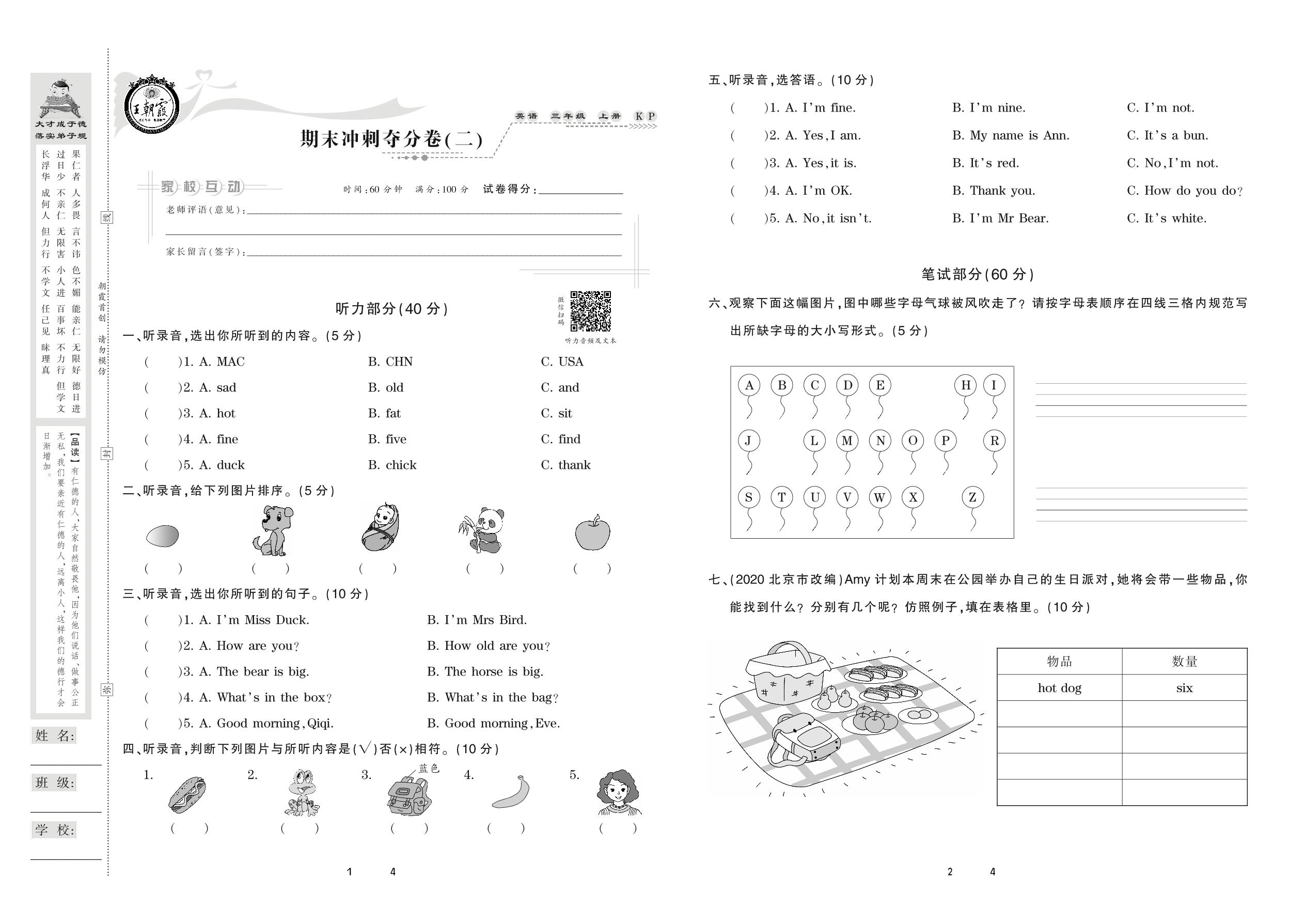 2020上册三年级英语科普版 期末冲刺夺分卷(二)
