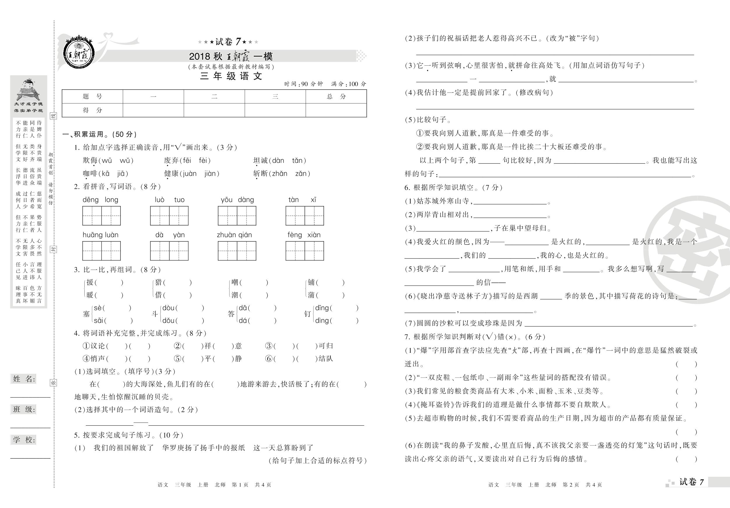 王朝霞期末模拟卷三年级上册语文(北师版)【7】