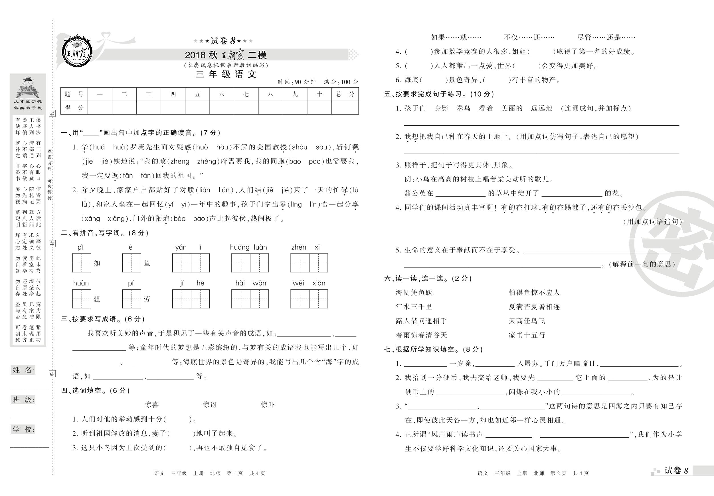 王朝霞期末模拟卷三年级上册语文(北师版)【8】