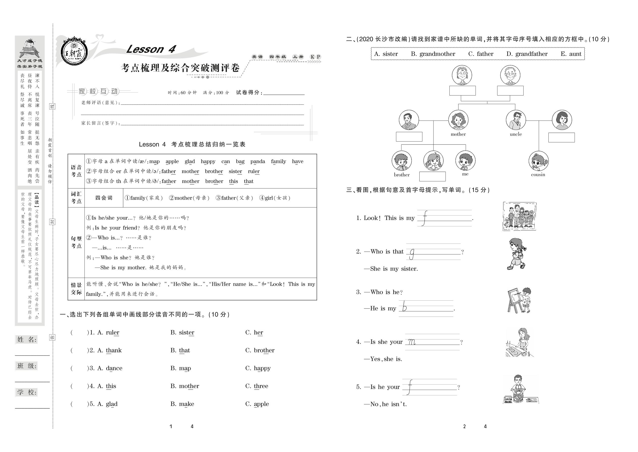 2020上册四年级英语科普版 Lesson 4 考点梳理及综合突破测评卷