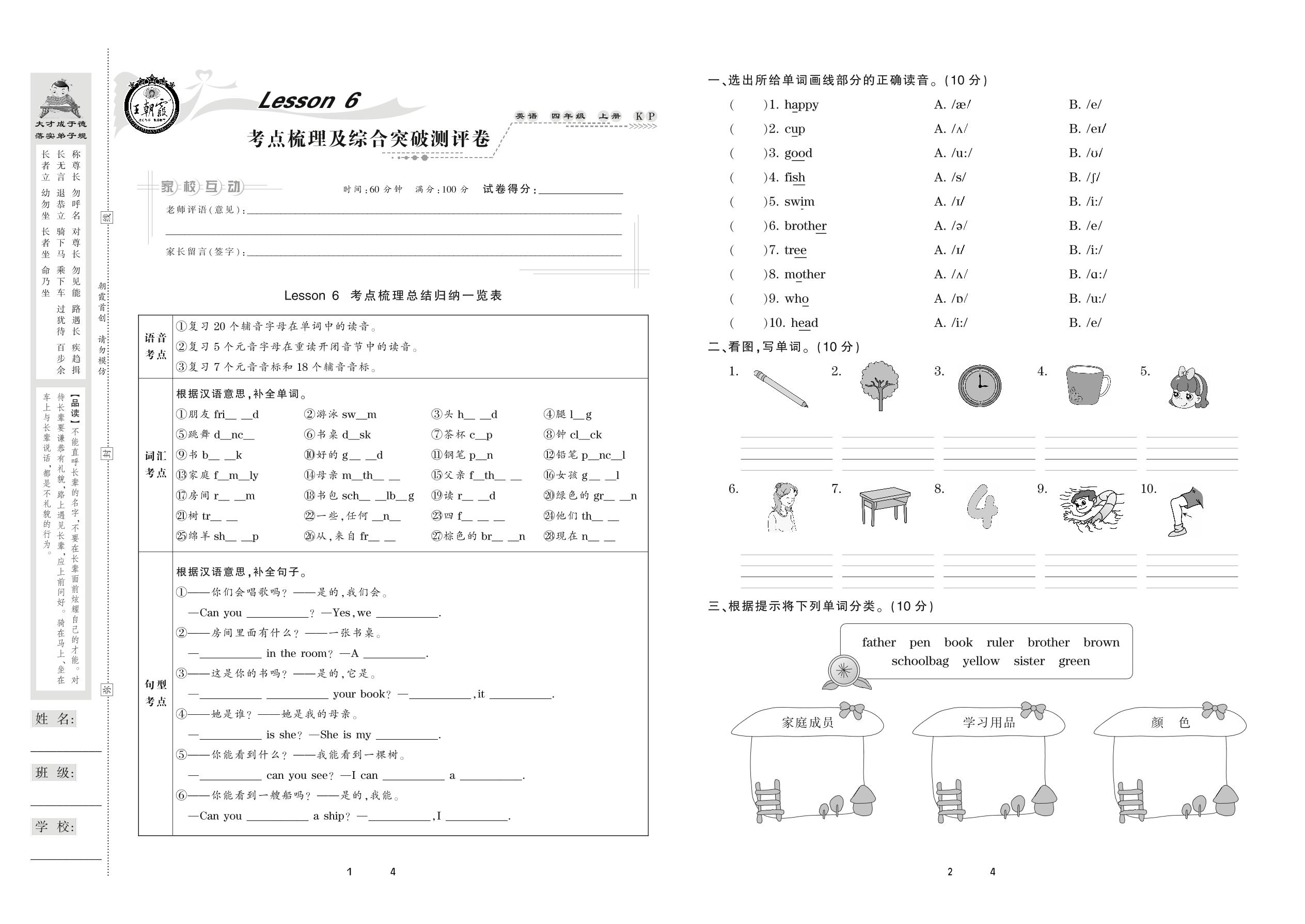 2020上册四年级英语科普版 Lesson 6 考点梳理及综合突破测评卷
