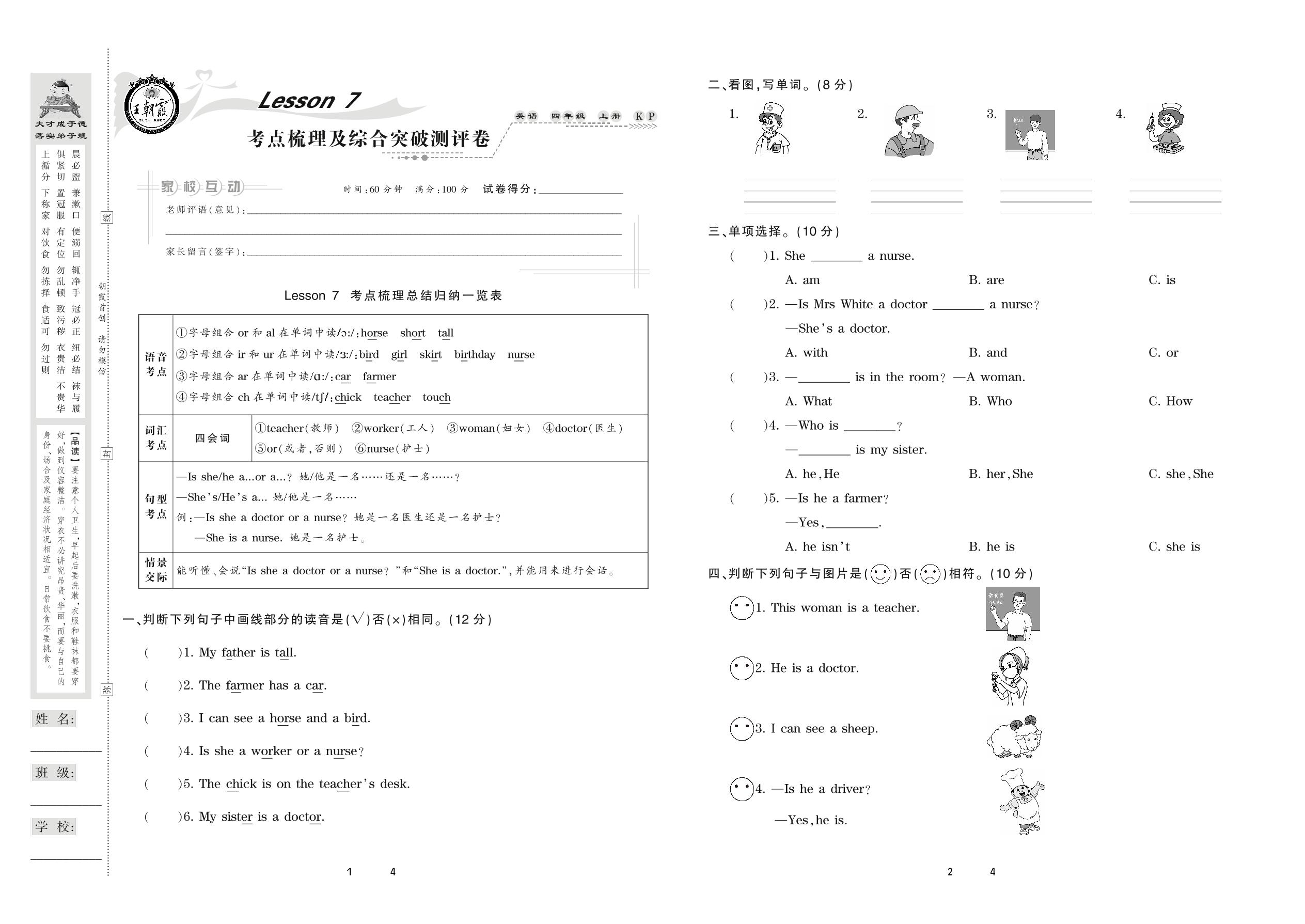 2020上册四年级英语科普版 Lesson 7 考点梳理及综合突破测评卷