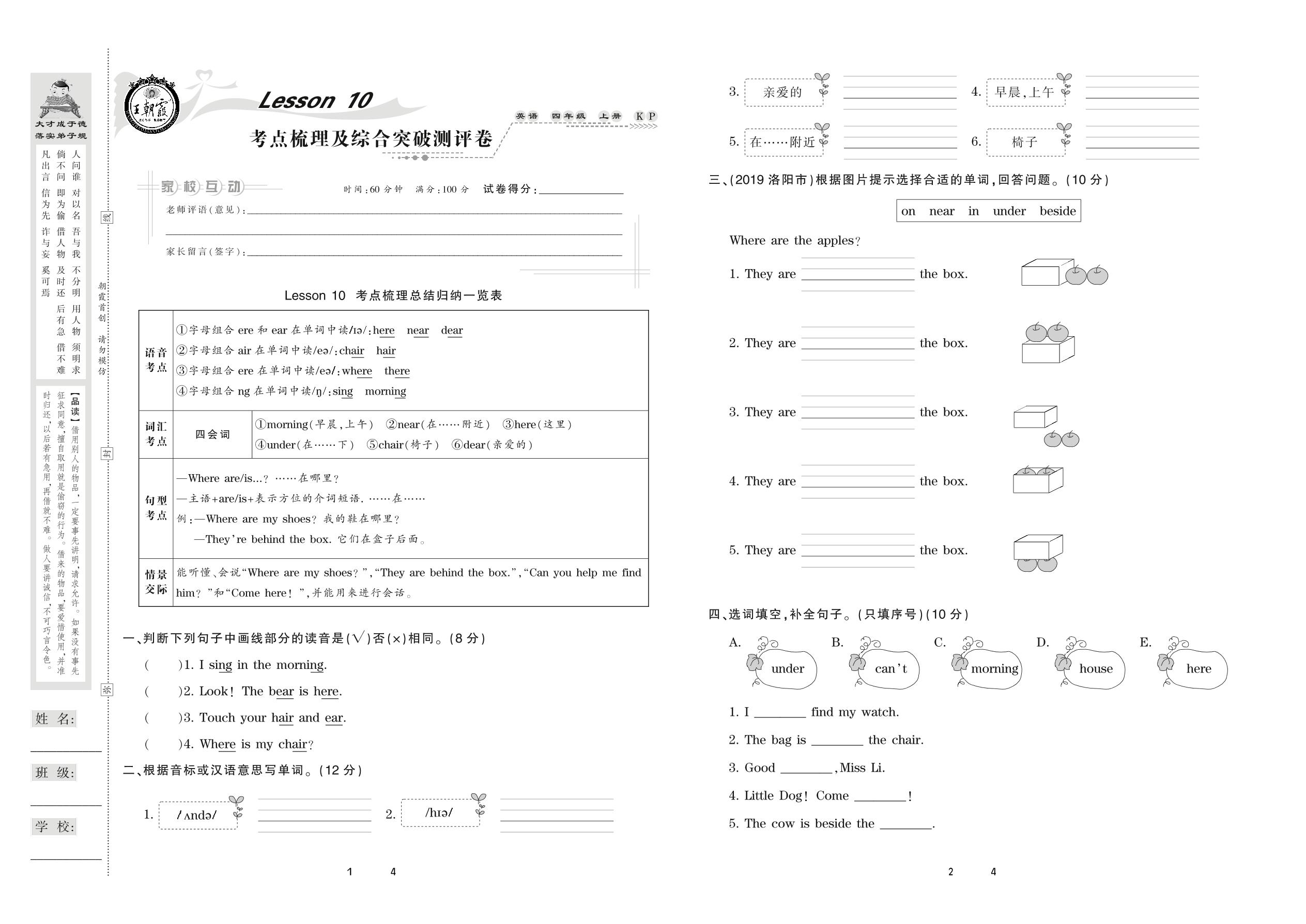 2020上册四年级英语科普版 Lesson 10 考点梳理及综合突破测评卷