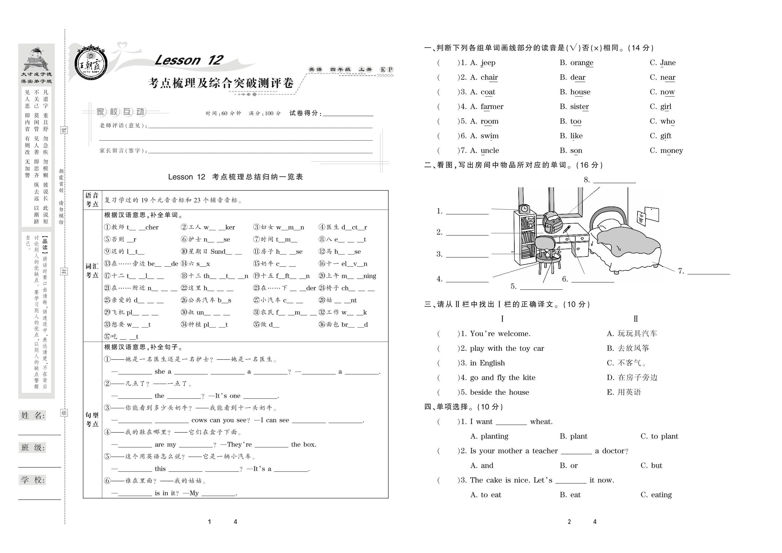 2020上册四年级英语科普版 Lesson 12 考点梳理及综合突破测评卷