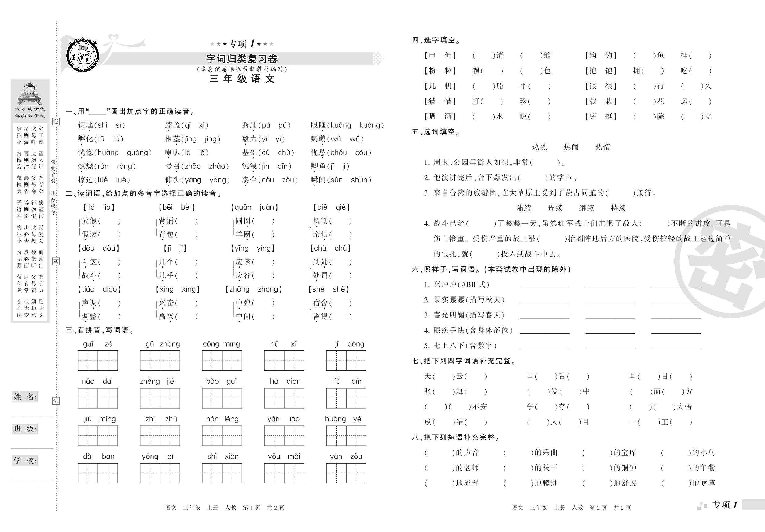 王朝霞期末专项卷——字词归类复习卷三年级上册语文(人教版)【0】