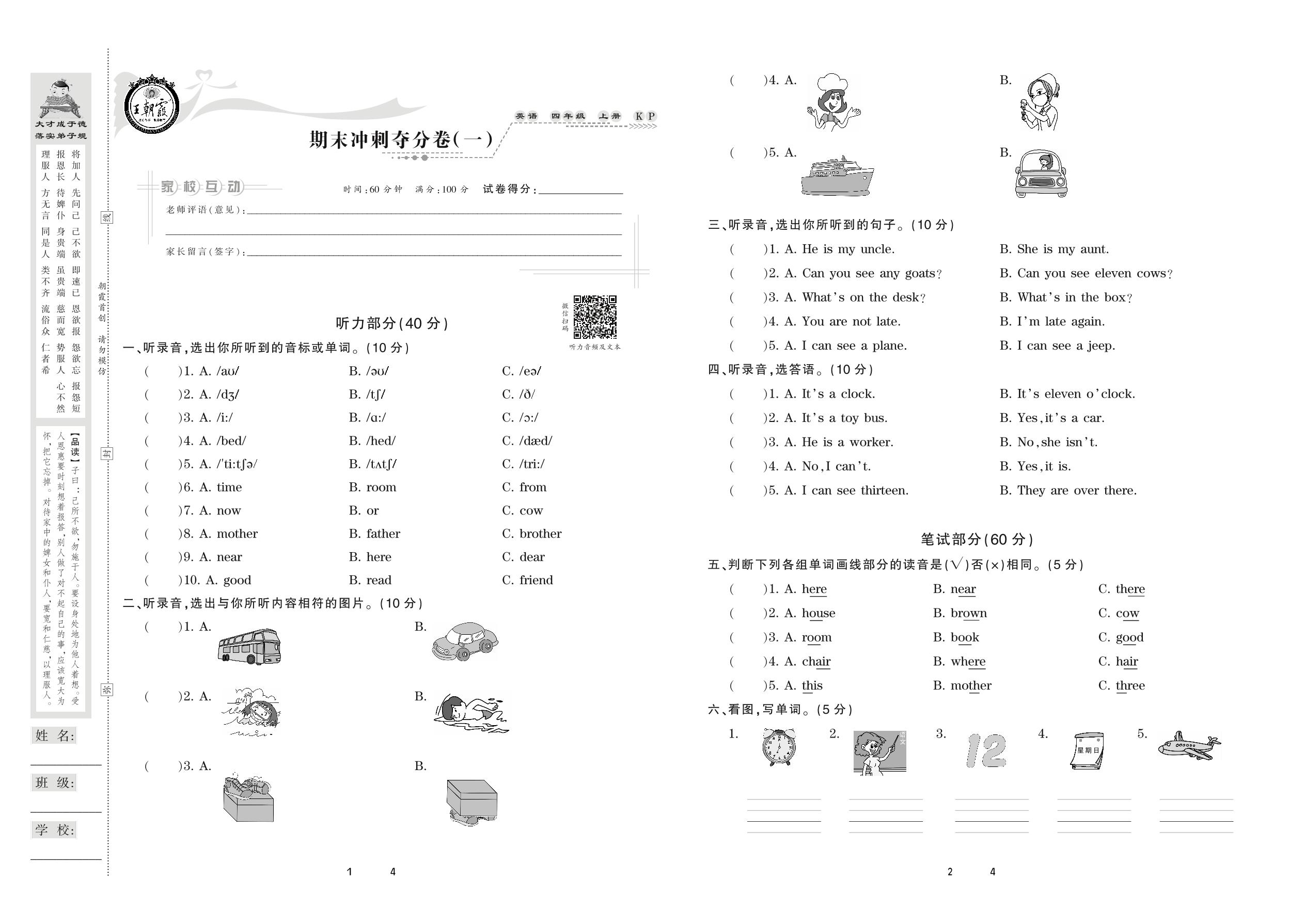2020上册四年级英语科普版 期末冲刺夺分卷(一)