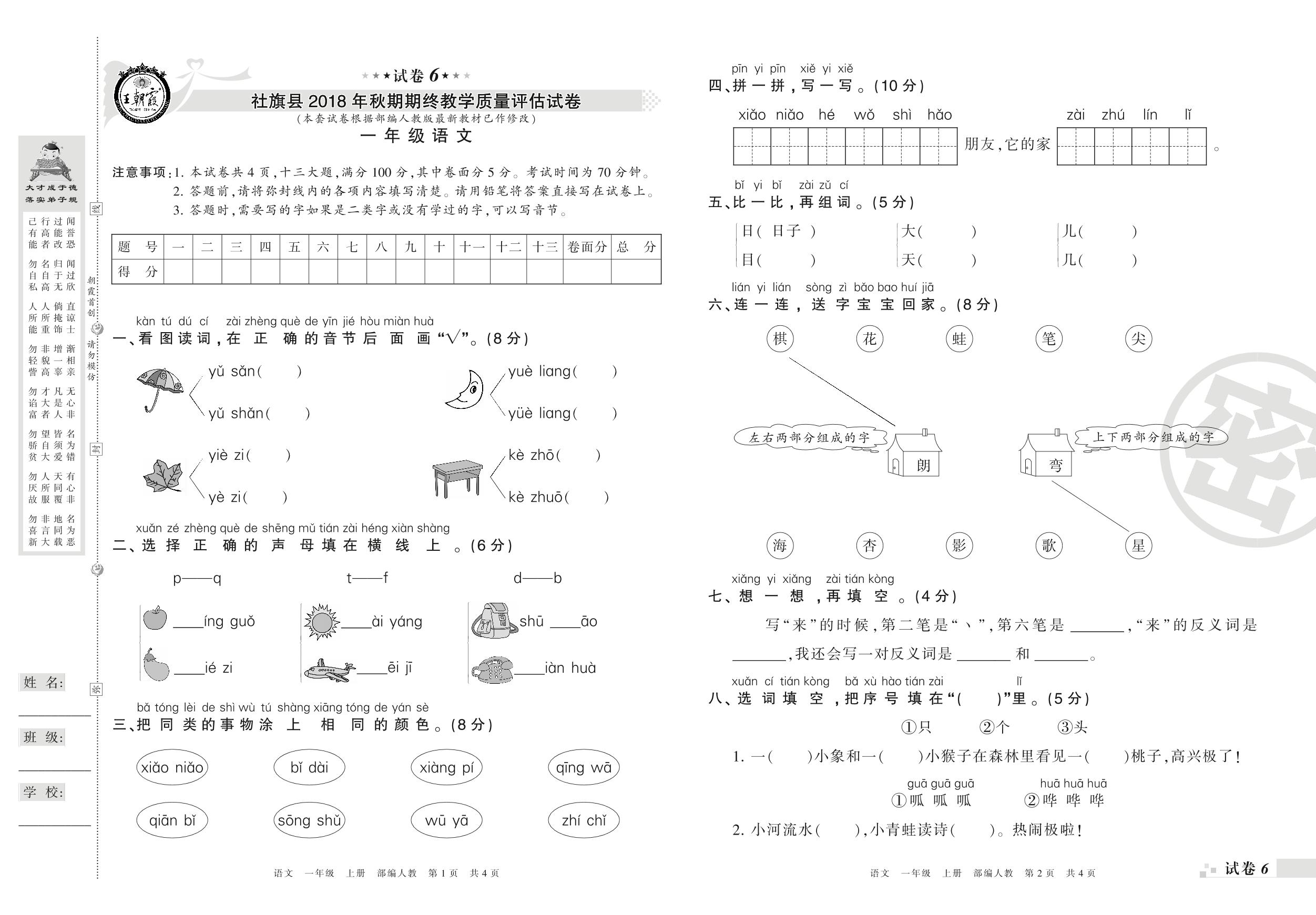 2018-2019学年第一学期南阳市社旗县一年级语文试卷(人教版)【6】