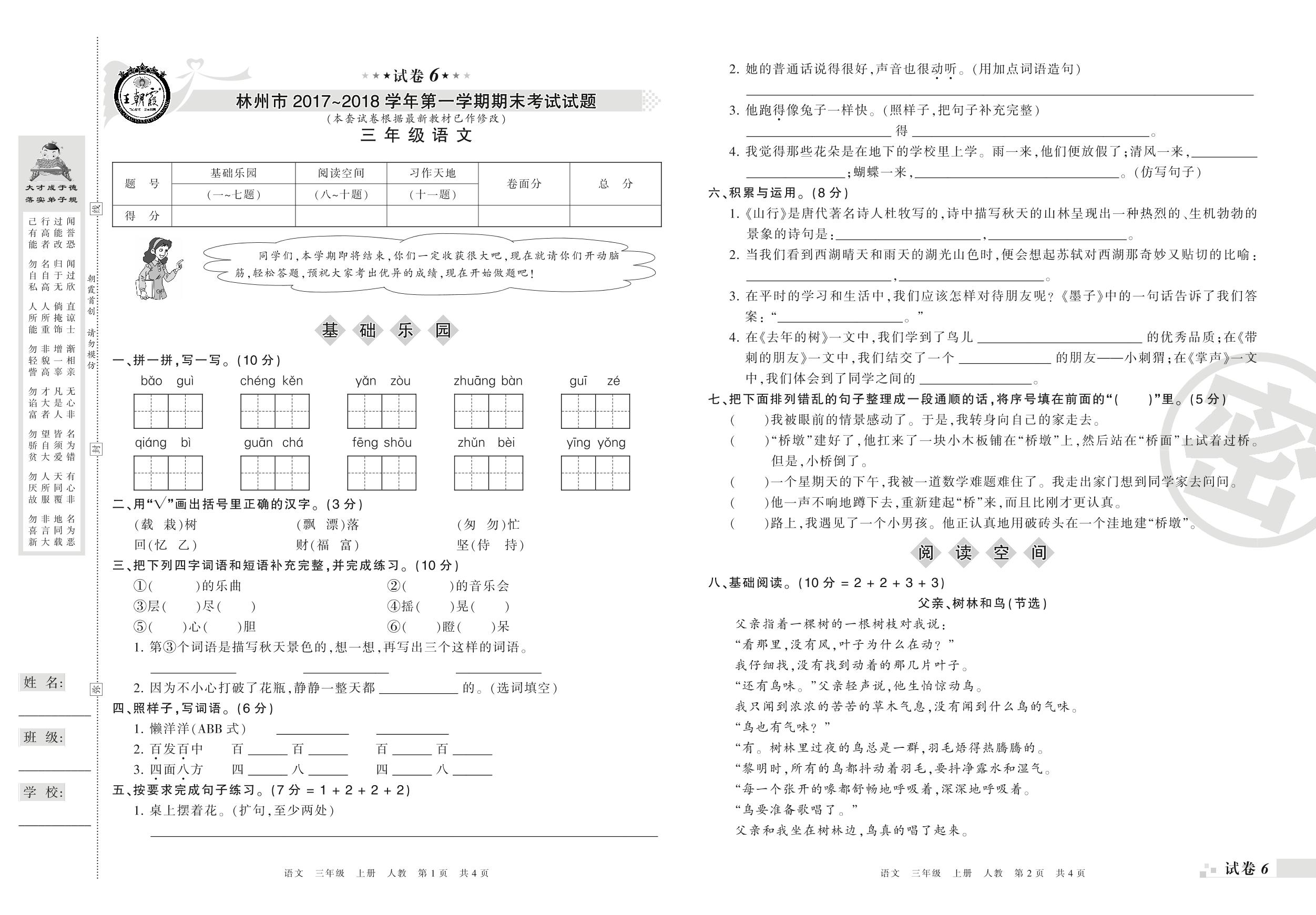 2017-2018学年第一学期林州市三年级语文试卷(人教版)【6】